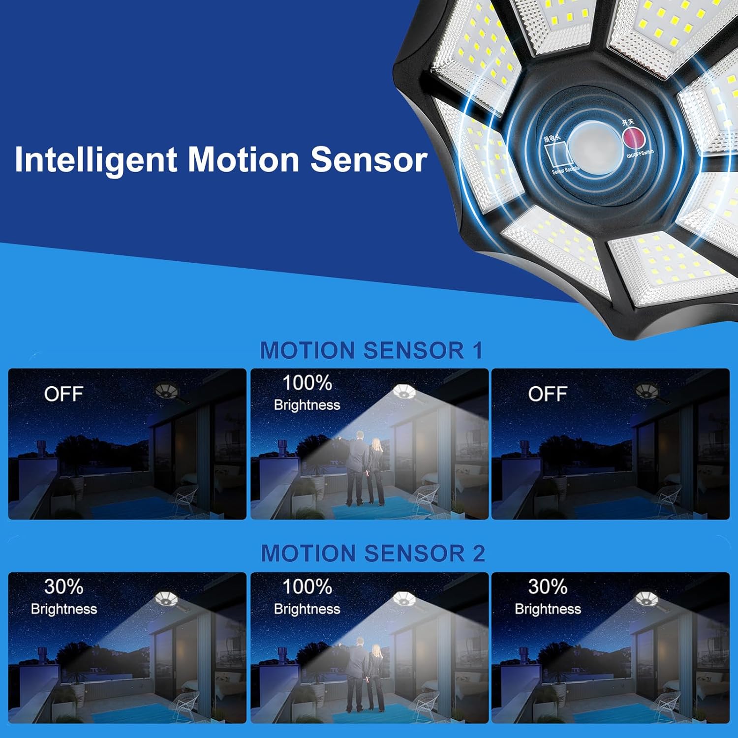 [Solar Lights For Outside] The solar motion detector light is equipped with 168pcs 6500k super bright LED beads. 8 luminous surfaces to provide a larger lighting area