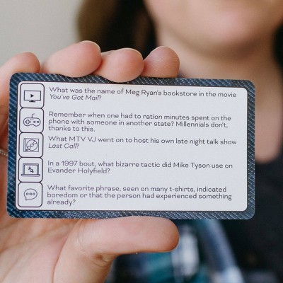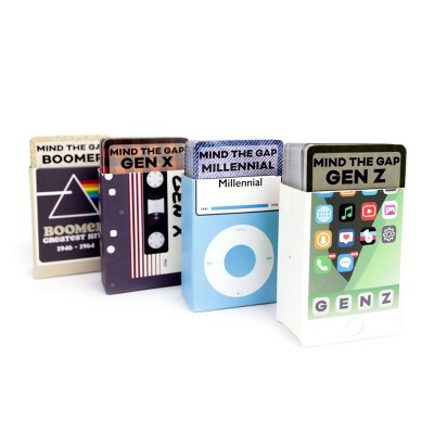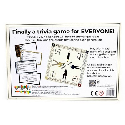 Mind the Gap from SolidRoots is a trivia game for the generations! Players divide up into equal teams. The idea is that the generations work together to make it around the board as quickly as possible. Put at least 1 person from each generation on each team. Or you can break the teams up by generation, pitting the generations against each other. The 5 trivia categories include TV/Film, Pop Culture, Music, Headlines, and Slang/Slogans. The more questions you answer right, the further you get to move along the board. If you land on a space with a star, the team must choose 1 member to draw a challenge card. The first team or player to make it all the way around the board- through each generation- and back to their colored space is the winner! Whether you are searching for fun new board games or family games for your next party- this is the trivia game for you. All you need is 2 players and an hour or less to play. Includes Gameboard, Boomer Cards, Gen X Cards, Millennial Cards, Gen Z Cards, Challenge Cards, 4 Movers, 1 Die, Instructions