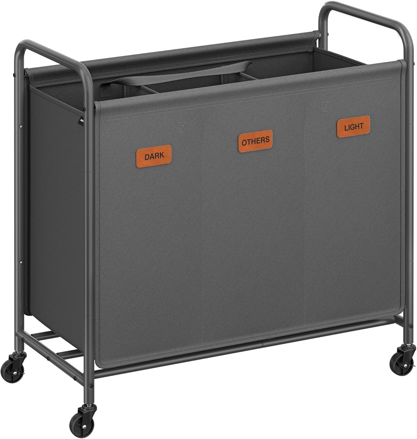 SONGMICS 3-Section Laundry Sorter, Laundry Hamper with Wheels, Rolling Clothes Hamper Cart with Large Capacity and Removable Bags, for Laundry Room, Bedroom, Bathroom, Slate Gray URLS330G01