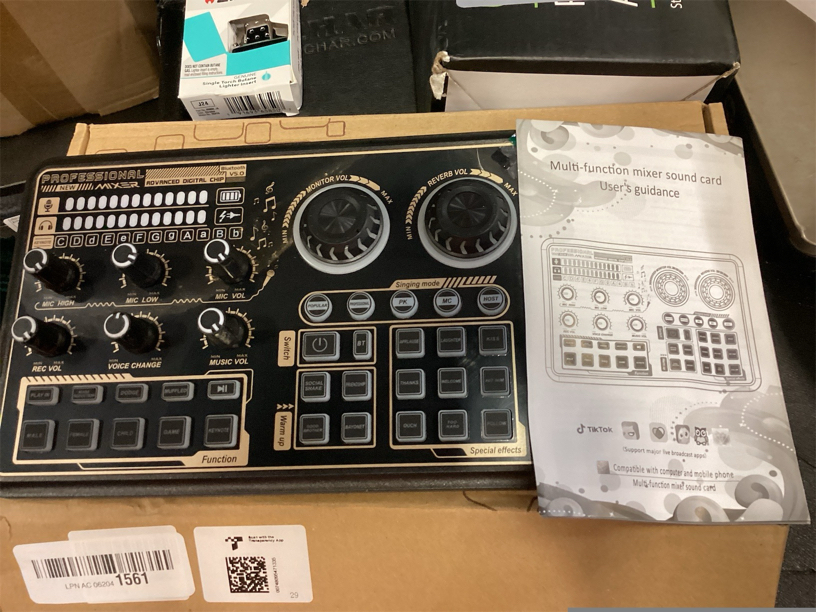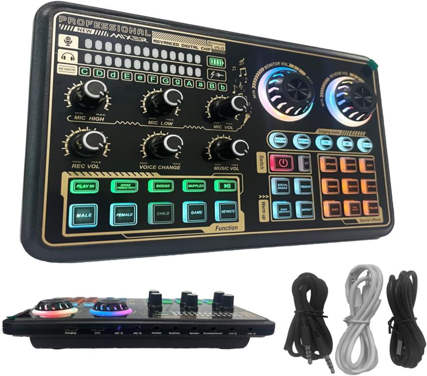 As a multifunctional digital audio mixer, SK600 provides a variety of special effects, scenes and functions, which makes your live broadcast more interesting and infectious. Quickly change each mode or effect according to your needs. Enjoy endless fun with easy operation. Specifications: Model: SK600 Color: Black & Gold Material: PC BT Version: 5.0 SNR: 106dB Output Power: 600mW Power Consumption: 5W Rated Input: 5V / 1A Endurance: 8-12H Battery Capacity: 3.7V / 1200mAh Frequency Response Range: 60Hz-15KHz Item Size: 21.1 * 13.1cm / 8.31 * 5.16in Item Weight: 387g / 13.65oz Package Size: 28 * 17.2 * 5.6cm / 11.02 * 6.77 * 2.2in Package Weight: 547g / 19.29oz Package List: 1 * Sound Card 1 * Type C Cable 1 * Live Broadcast Cable 1 * Accompaniment Cable 1 * User Manual