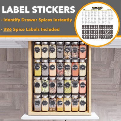 Neatly Organize with Complete Set: Includes drawer spice rack, 28 glass jars, and 386 labels for a clutter-free kitchen.