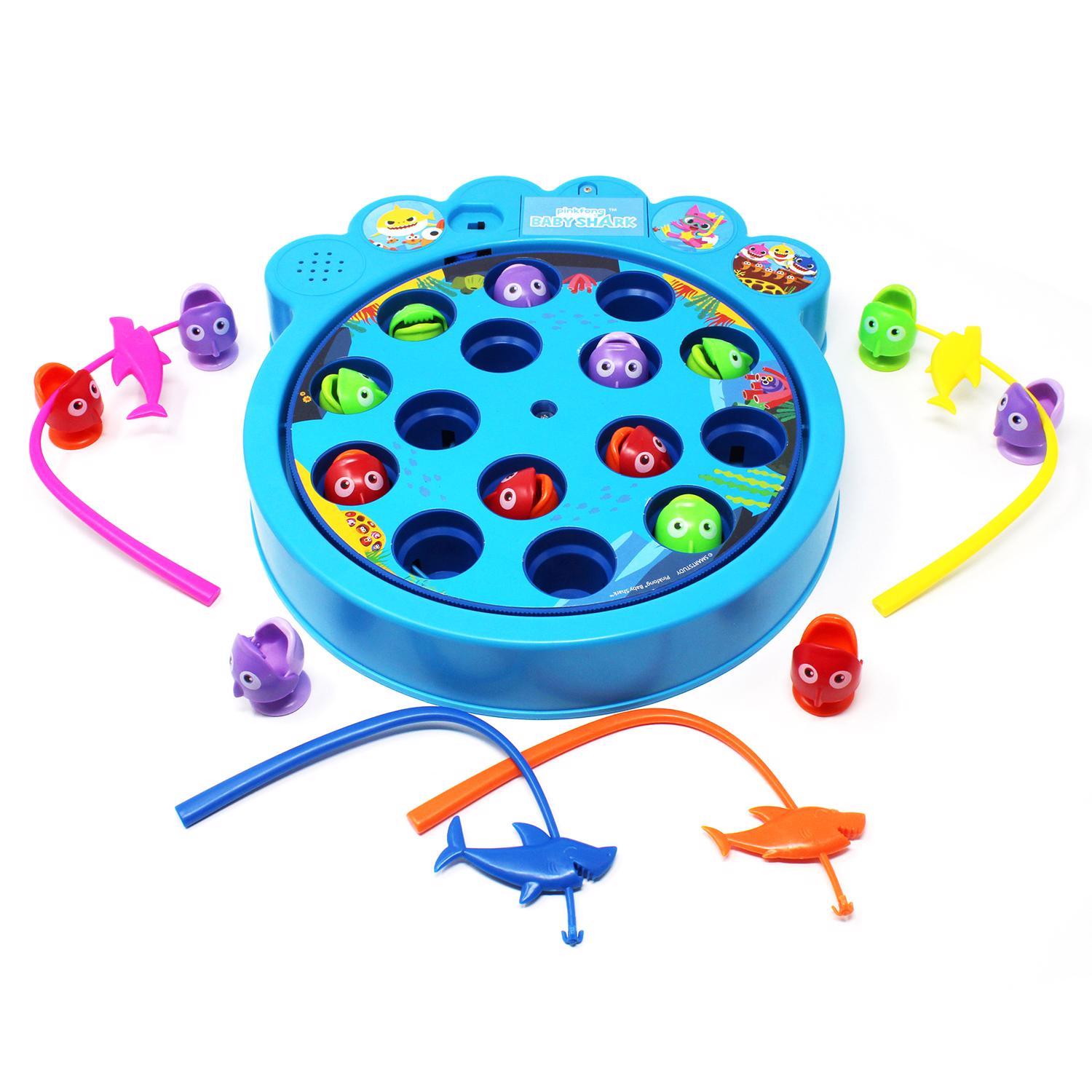 The classic Fishing Game has never been more fun, This Baby Shark Fishing Game features four adorable characters from the global phenomenonâMommy Shark, Daddy Shark, Grandma Shark and, of course, Baby Shark, It's your job to grab the fish with your Baby Shark-themed fishing rod as the board spinsâthe player who reels in the most fish wins, Plays the Baby Shark Song. Recommended for two to four players, ages four and up. Requires two AA batteries (not included).