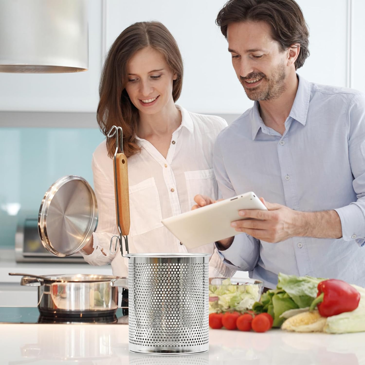 Quality Material: The pasta strainer is made of food grade stainless steel, safe and durable.The wooden handle with 2 hooks is heat resistant, and long wooden handle could keep hands out of harms when cooking.