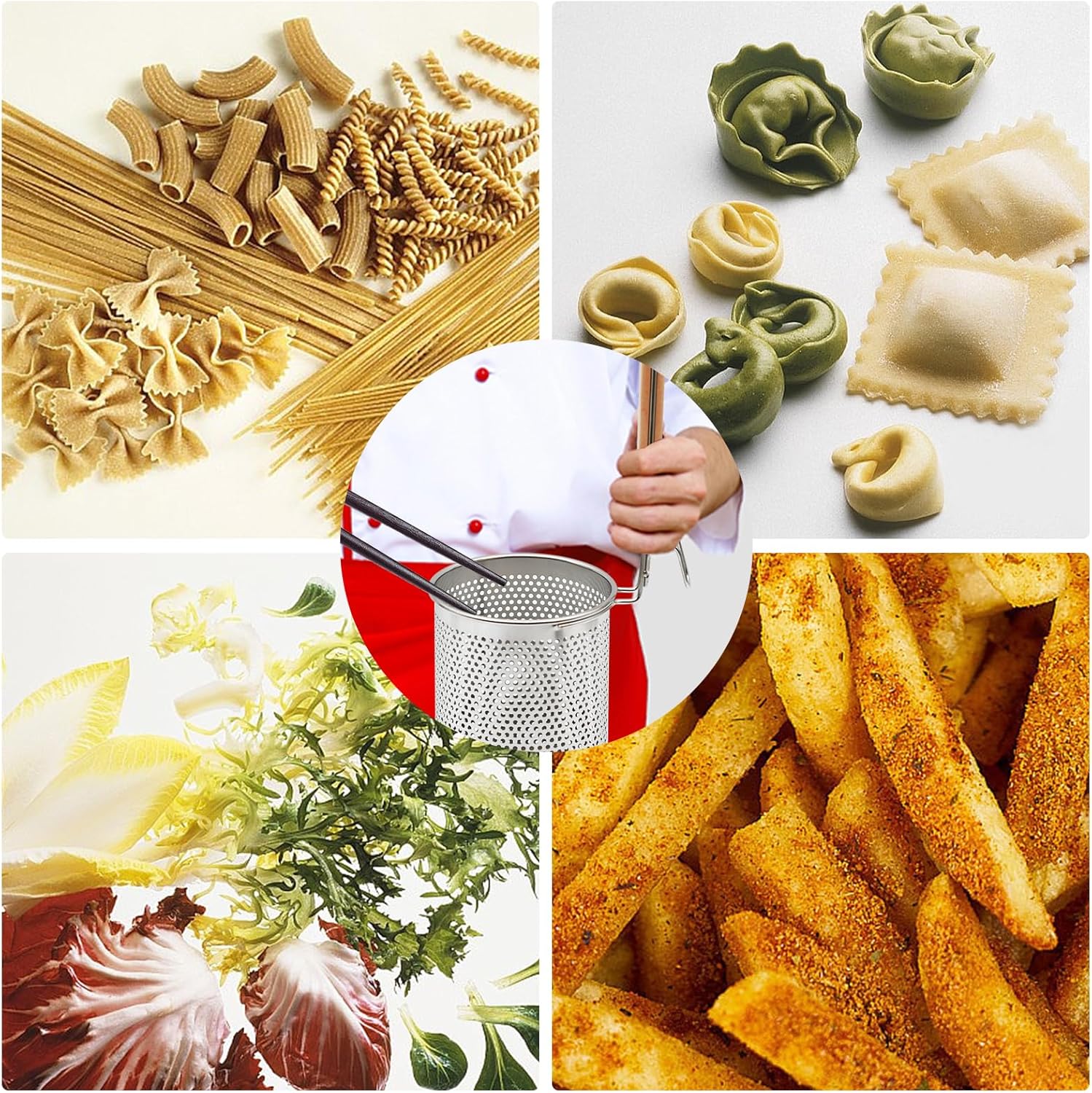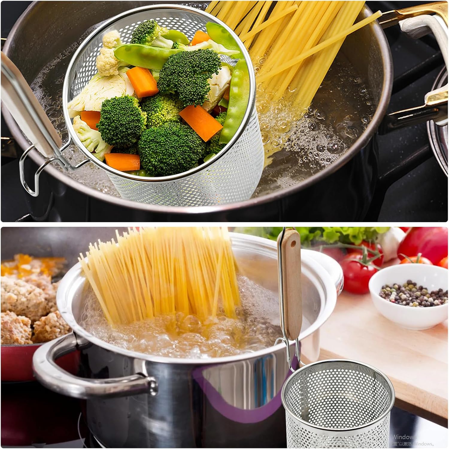 Widely Application: The pasta strainer basket with handle adopts deep basket design, which can be applied for washing, filtering, steaming, blanching, boiling and reheating vegetables, pasta, noodles, fruits, eggs, dumpling etc.