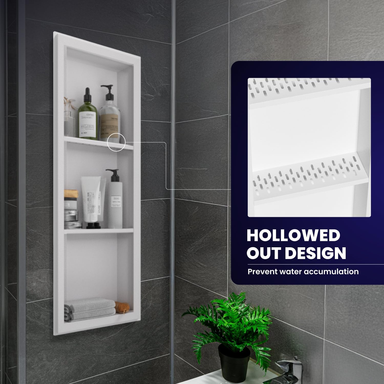 Stainless Steel Shower Niche 12" x 36", 3-Layer Wall Mounted No Tile Needed, Recessed Shower Niche with Hollow Partition, Shower Niches Shelf for Bathroom Organizer, White