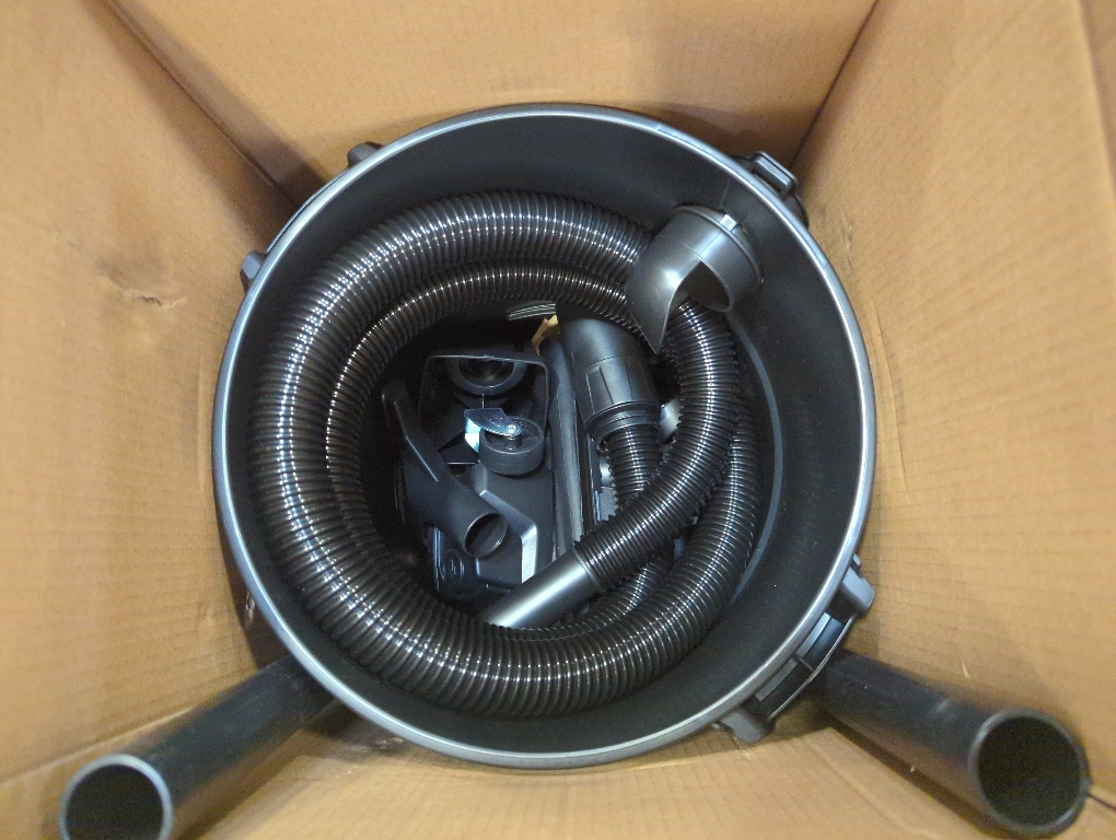 Features: On-board accessory storage, swiveling casters for easy maneuverability. 6-Gallon poly container with 10 ft. power cord. The powerful rear blower port instantly converts the wet dry vacuum into a power blower.