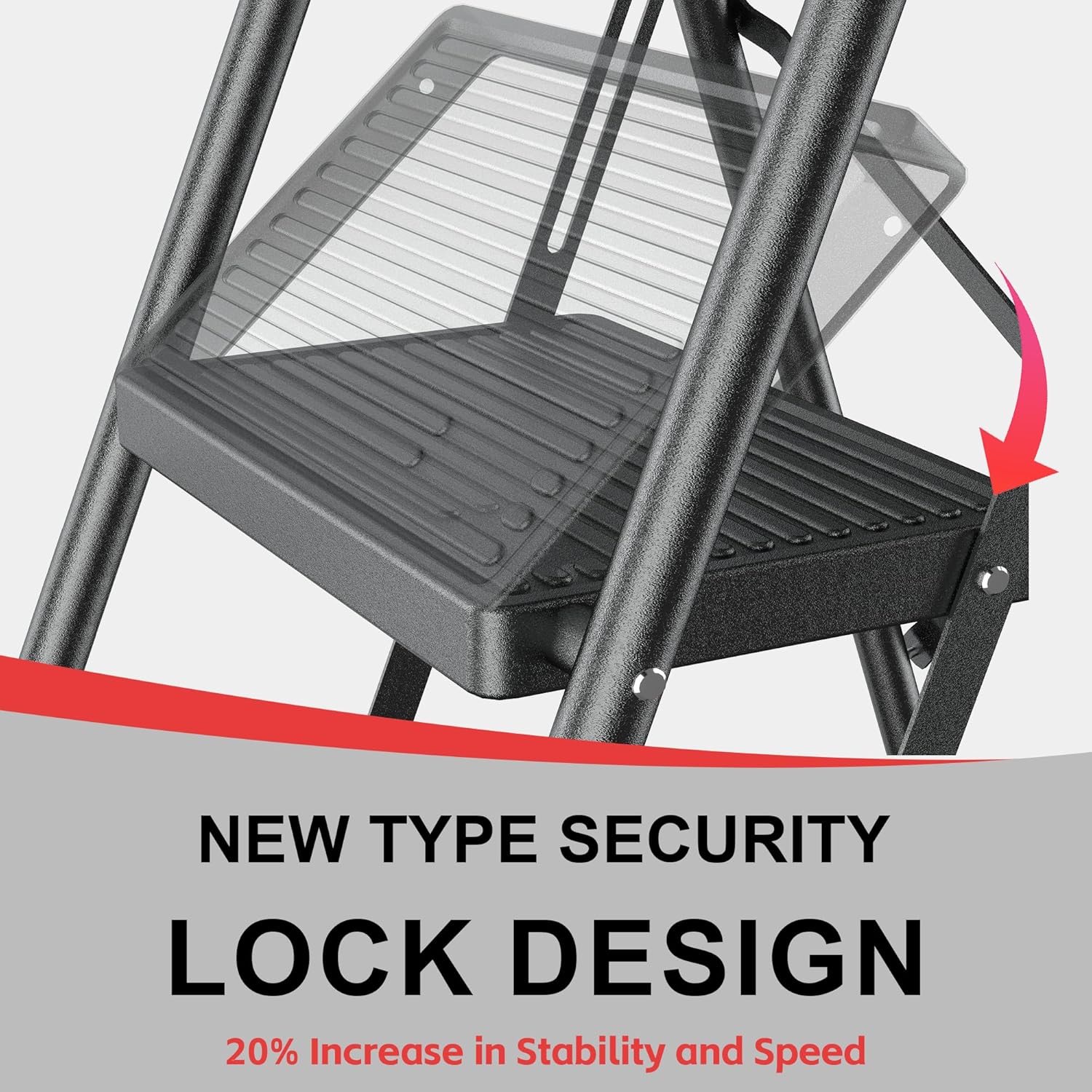 Enhanced Safety and Stability - Featuring a high-strength steel frame and gravity lock system, our step ladders offer robust support that engages securely for your peace of mind. With Dual-Sided Reinforcing Ribs, Our ladders provide a sturdy and reliable climbing experience, ensuring stability and reliability in every use. This makes them ideal for kitchen step stools for adults and stepping stool for adults, offering a safe and secure option for reaching high places.