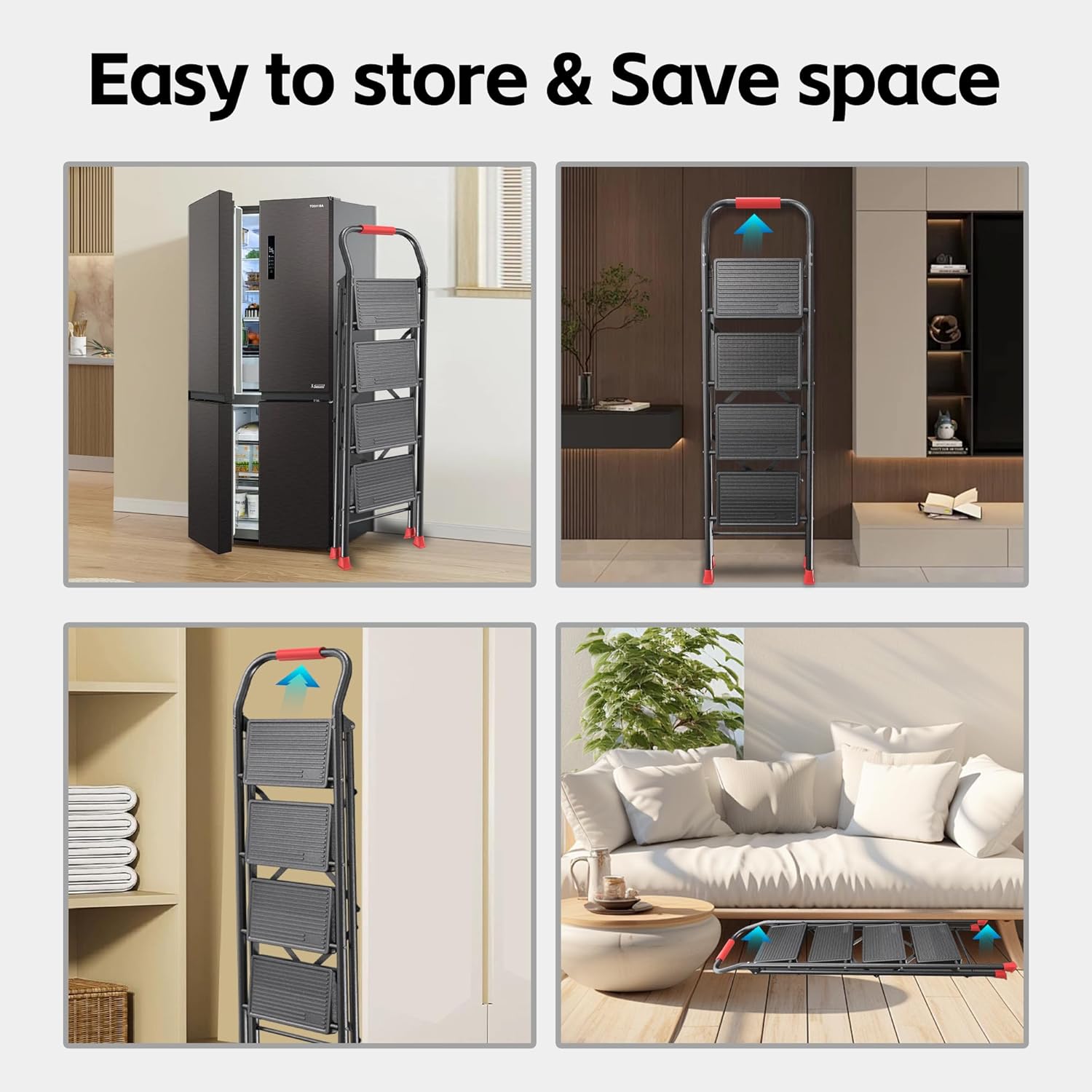 Ultra-Portable and Space-Efficient Design - Folding down to an astonishingly slim profile of just 2.95", our step stool ladders are the perfect space-savers for your home. Ideal for storage in closets, under beds, or behind doors, our fully assembled ladders are ready to use out of the box, saving you time and effort. This makes them the ultimate foldable step stool and ladder for home use.