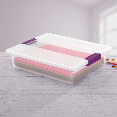 Keep your space neat and organized with Sterilite Clip Boxes! Designed to be modular, you can create your own storage system with the five different sizes. Stack Clip Boxes for efficient use of vertical storage space. The Large Clip Box is a great solution for storing and organizing items throughout the home and office, such as coloring books and crayons, crafting supplies, 8.5" x 11" paper and notebooks, or tape measures, tape, and cords in the workshop. The clear base and lid allow contents to be easily identified from any angle, and the color accent latches ensure that the lid remains secure to the base. The Large and Deep Clip Boxes share the same lid, allowing the shallow and deep size to be stored in the same footprint. The overall assembled dimensions of this item are 14" L x 11" W x 3 1/4" H.