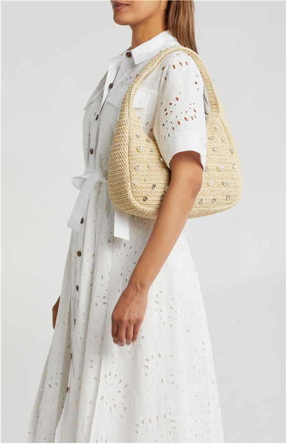 Perfect for toting sunnies and gloss, this bead and rhinestone embellished shoulder bag adds a charming touch to your resort-ready look while keeping essentials within easy reach.