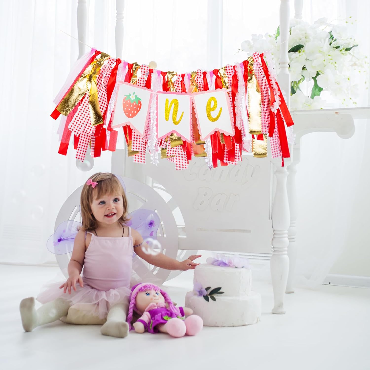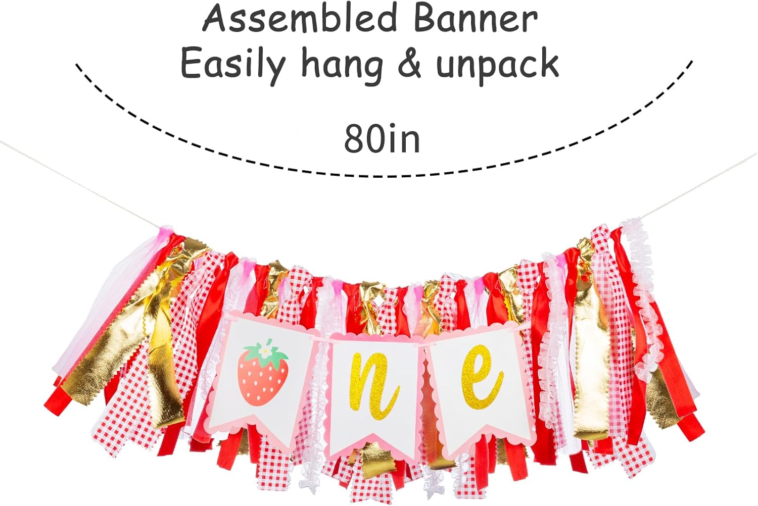 Meaningful Birthday Decoration:The banners are made from cards and canvas with cute strawberries and the letters "n" and "e" in gold. Strawberries symbolize sweetness, which symbolizes your healthy, and happy life for baby. Pink and red ribbons, fits the fairy girl perfectly! Life needs a sense of ritual, its nice theme makes it suitable for your child, and it can be kept as a memento of your baby's first milestone birthday.