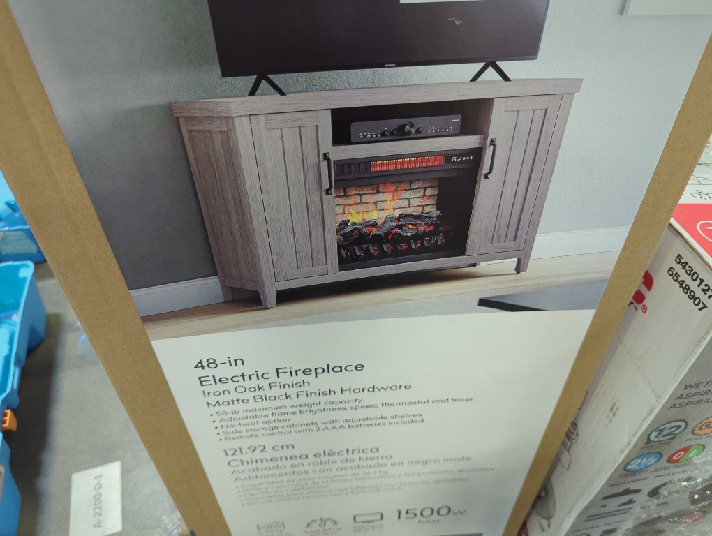 This Style Selections electric fireplace TV stand is a stylish and practical solution to home entertainment for any room in your home. Its iron oak finish works perfectly with the matte black hardware. Store media and gaming components in the generous upper storage space, or open the doors to reveal 2 side storage cabinets with adjustable interior shelves. The innovative electric insert has a realistic LED log set and brick pattern, and a powerful 5,100 BTU infrared quartz heater can be operated with or without the flame effect. Adjust the temperature, flame brightness, speed, and sleep timer using the digital control panel or included remote control.