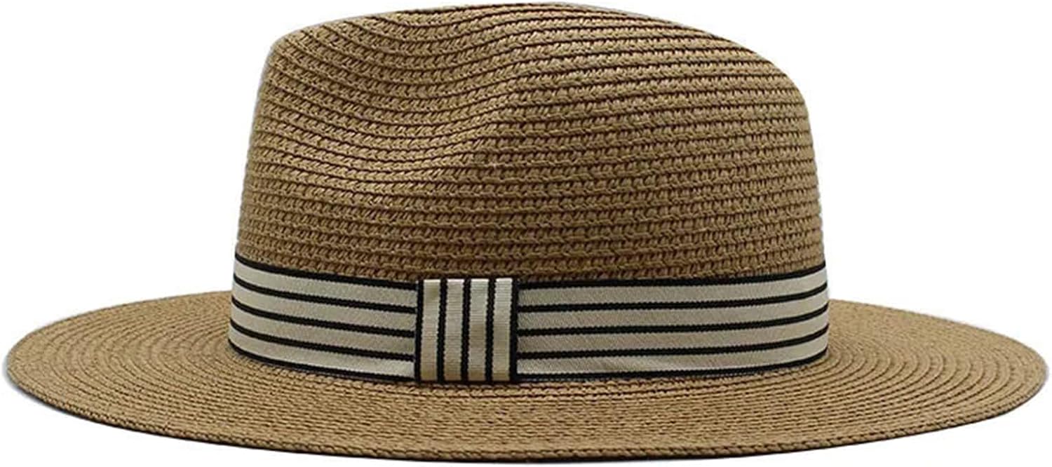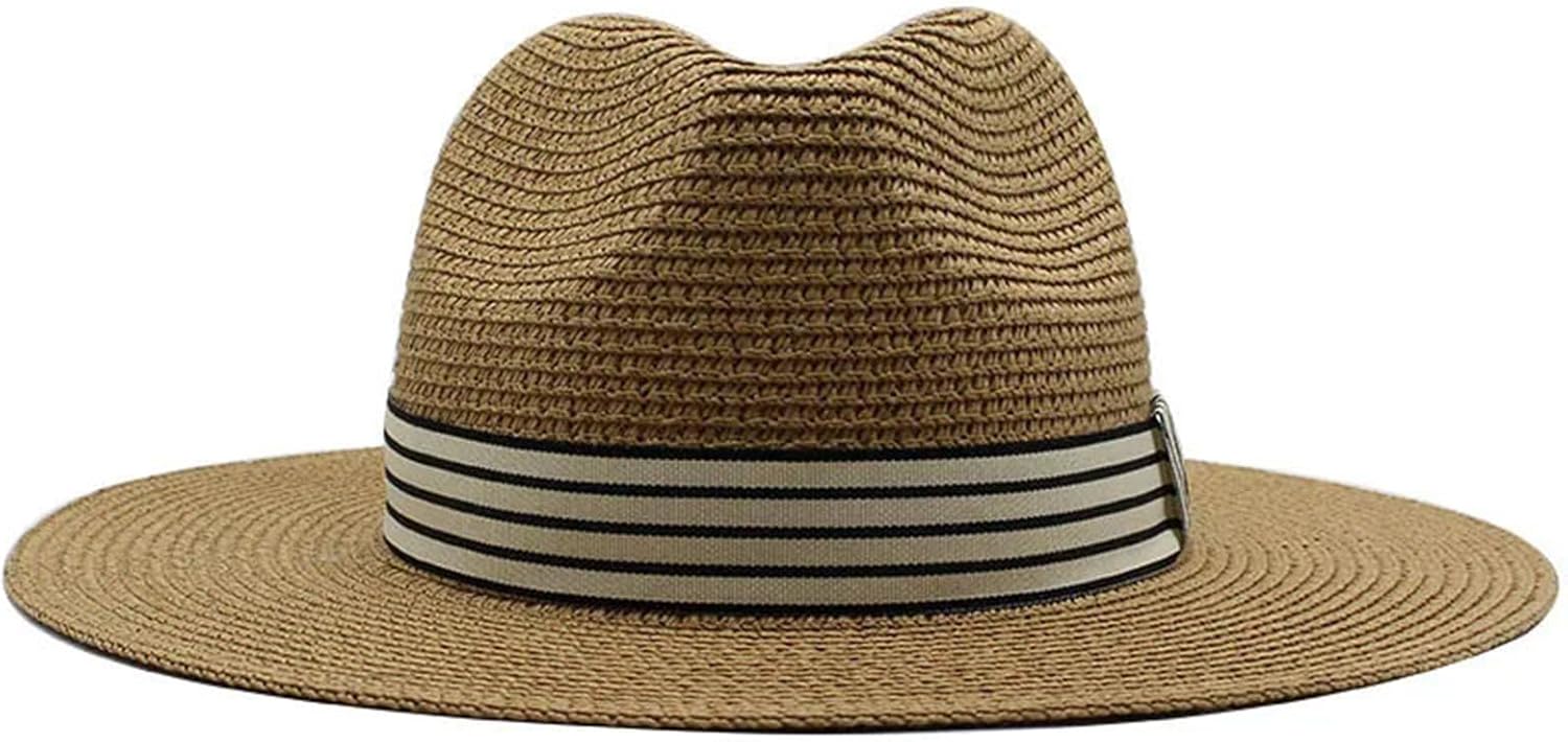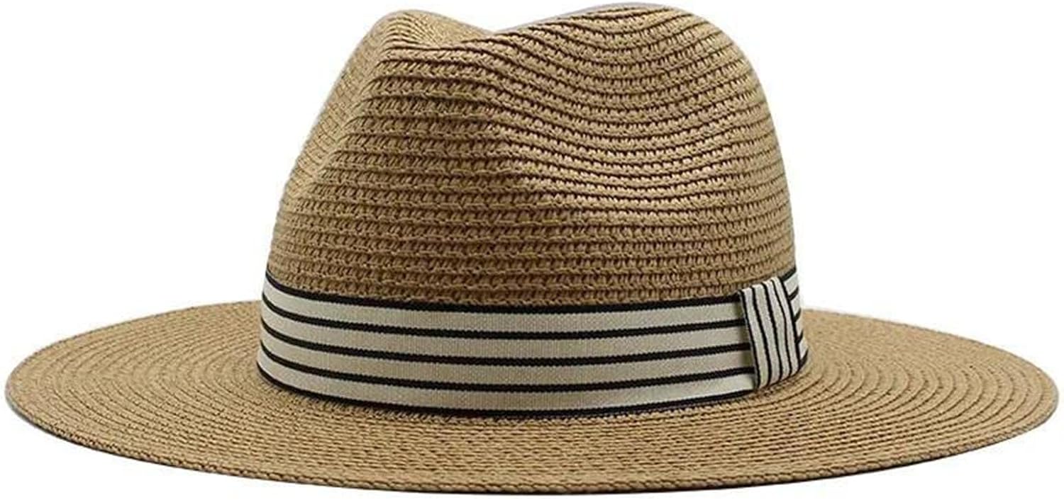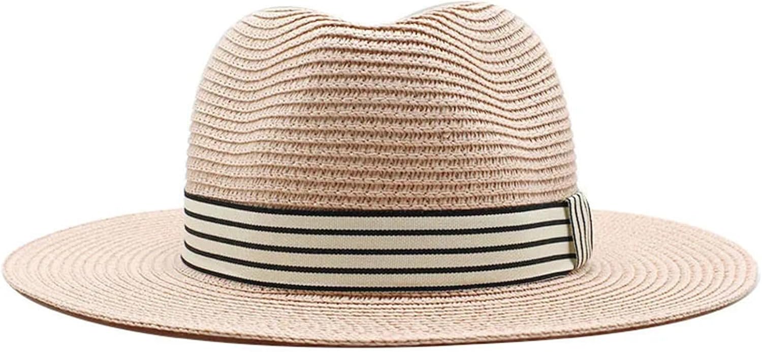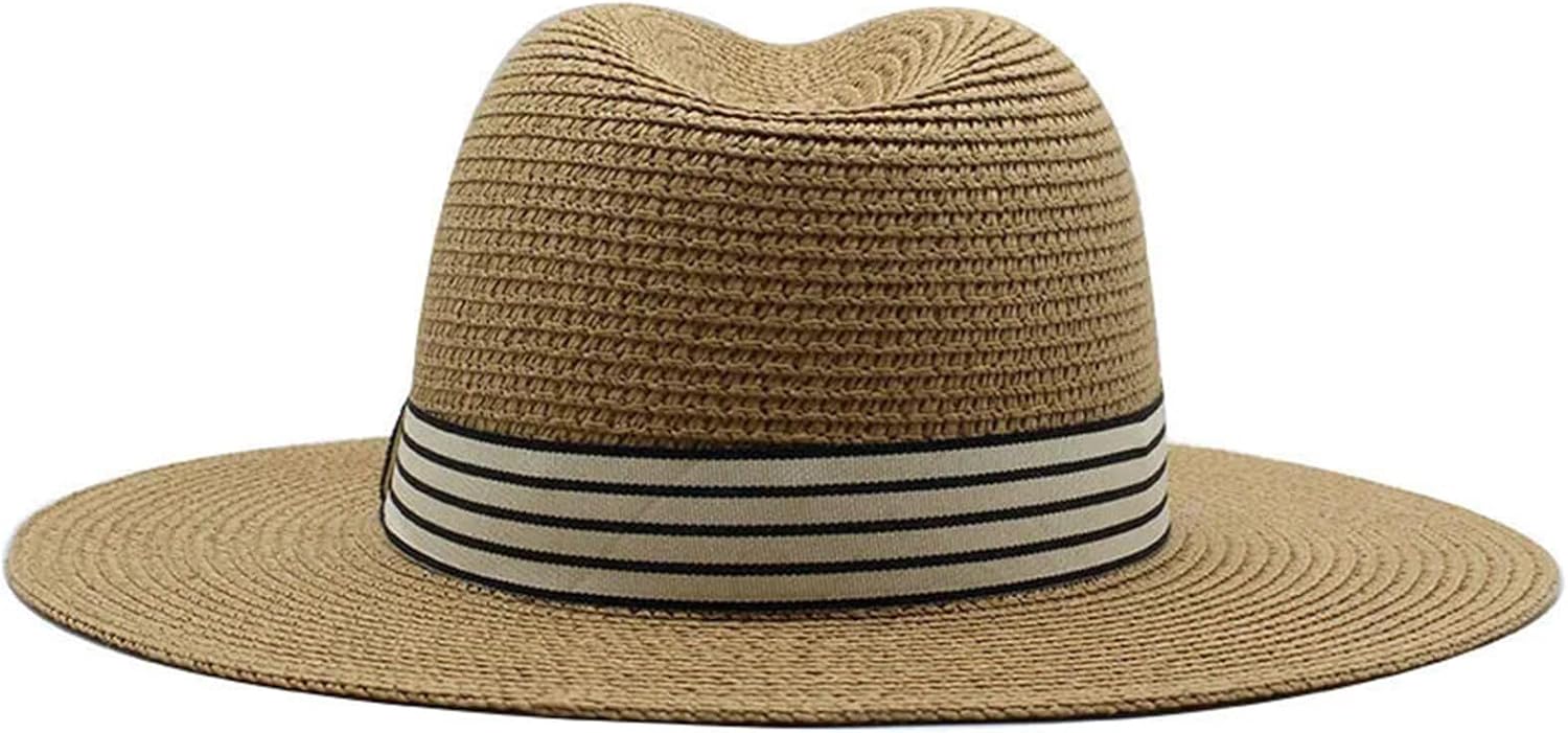 Sun Hats For Women Men Panama Wide Brim Straw Fedora Hat With Striped Band Foldable Summer Sun-Shading Floppy Hat