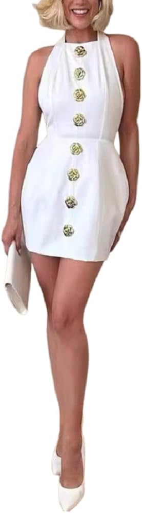 FEATURE - This sexy mini dress feature with halter neck,sleeveless,open back,back zipper and clip closure,mini length,Not stretchy,the decorative rose buttons add a touch of classy to this already stylish piece,elegant A-line dress,old money clothes,party dress,holiday tweed dress.