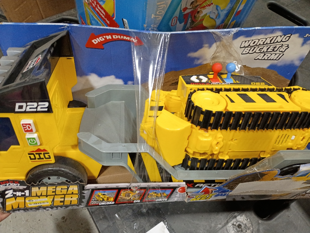 This construction vehicle is action packed with two vehicles in one for twice the fun. The long hauler is 24 inches long with lights, sounds and a friction-rev motor. Just pull back and watch it roll. Once you arrive to your destination drop the gate, unload the backhoe loader and get to work. Use the joysticks to control the front end loader bucket and excavator arm. Equipped with rubber tracks for ultimate traction, push the forward and reverse button to watch it move.