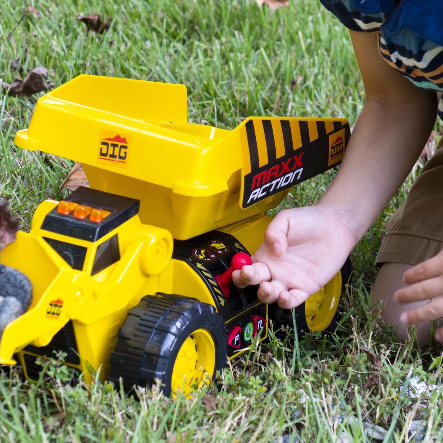 Dig, Dump and Drive with the ultimate construction vehicle. Young workers can pretend to take the driver's seat with the 2-N-1 Dig Rig. Realistic lights and sounds will help create the environment of a real construction site. Hear the roar of the automotive sounds while you drive forward and reverse across the roughest terrain. When kids want to play in the dirt or sandbox, the Dig Rig is the perfect choice for sensory play. Featuring real scooping and digging action, this vehicle has everything to really get the job done. Use the levers to dig up dirt, toys and more. Liftover 8 pounds of materials into the bed of the rig and dump it out. Measuring over 18 inches long, this vehicle can take on the toughest tasks. Encourage independent playtime with this two-in-one toy that will let kids live out their big imaginations. Maximum power, maximum action, maximum fun.