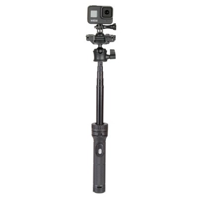 The Sunak VersaPod is a combination tabletop tripod and handheld mount all in one. It has a fully telescopic 6-section column and foldable legs with non-marring rubber tips. When the legs are held together, it transforms into a handheld unit for portable usage or selfies. The Bluetooth remote integrated into the leg allows you to take pictures and videos with your Apple or Android smartphone up to 30 feet away. The kit is designed for compact cameras, smartphones and GoPro. The dual-function ball head platform can support a compact camera or camcorder, but when you unfold the platform, it opens up to reveal the smartphone mount. At the top of the smartphone mount is a cold shoe for attaching items, such as a video light, microphone or other accessory. The polycarbonate chassis and legs are lightweight, yet strong enough to support up to 6 lb. The legs can be used as a tabletop mount, or when you grasp them together, they become a handheld support for remote on-the-go usage or for a selfie mode. The 6-section telescopic column is made from aluminum, so the unit is not only lightweight but also corrosion-resistant, sturdy, and durable. It can be adjusted from 8.25 inches to 29.5 inches, capturing a wider field of view at any time. The VersaPod includes a rechargeable Bluetooth remote for Android and Apple smartphones, which is built into the leg. The Bluetooth trigger can easily be removed for remote usage up to 30 feet away. The kit also comes with a GoPro mount, so you can attach your GoPro too!