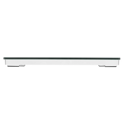 WW Scales by Conair® - Super Large LCD Display digital scale with high contrast, easy-to-read, 2 inch digital display with blue backlight. This bathroom scale features a durable 11.8 inch x 11.8 inch platform, with a 400 pound capacity. This white glass scale fits perfectly with most bathroom decor and is easy to use. Simply place on a hard, flat surface, and step on! Scale operates on 3 long-life AAA batteries (included).