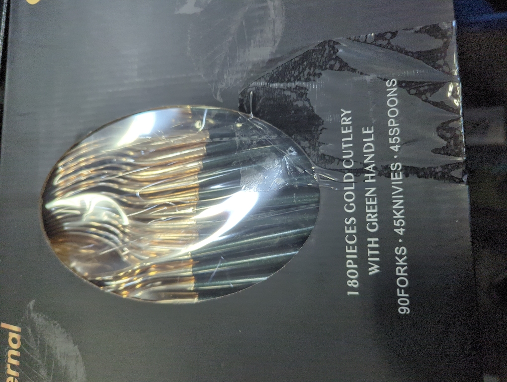 Value Pack:gold plastic silverware include 45 knives,45 dinner forks,45 dessert forks,45 spoons. It have polybag in the box. If you can't use all of the cutlery in one time, pls put back in the polybag which will help you to keep them clean.