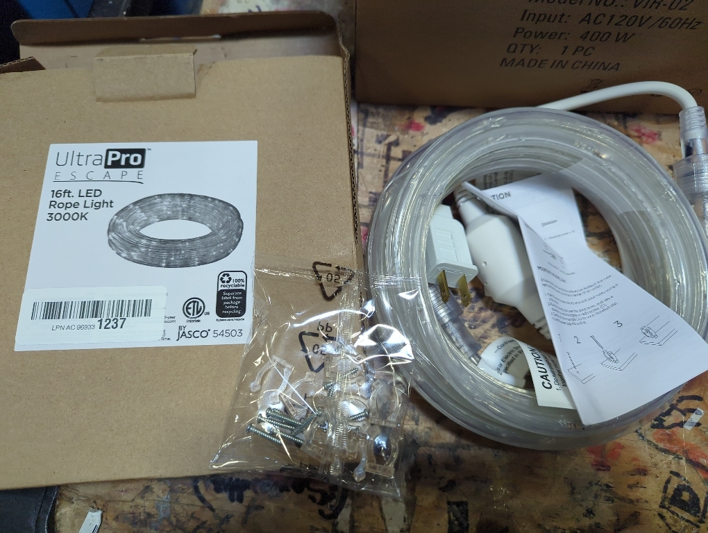 WHAT YOU GET: 50 feet rope light, 2 power plugs, 1 accessory kit, 1 manual. Note: To avoid burning out the light strip due to heat dissipation issues, before connecting the light strip to the power supply, be sure to spread it apart first.