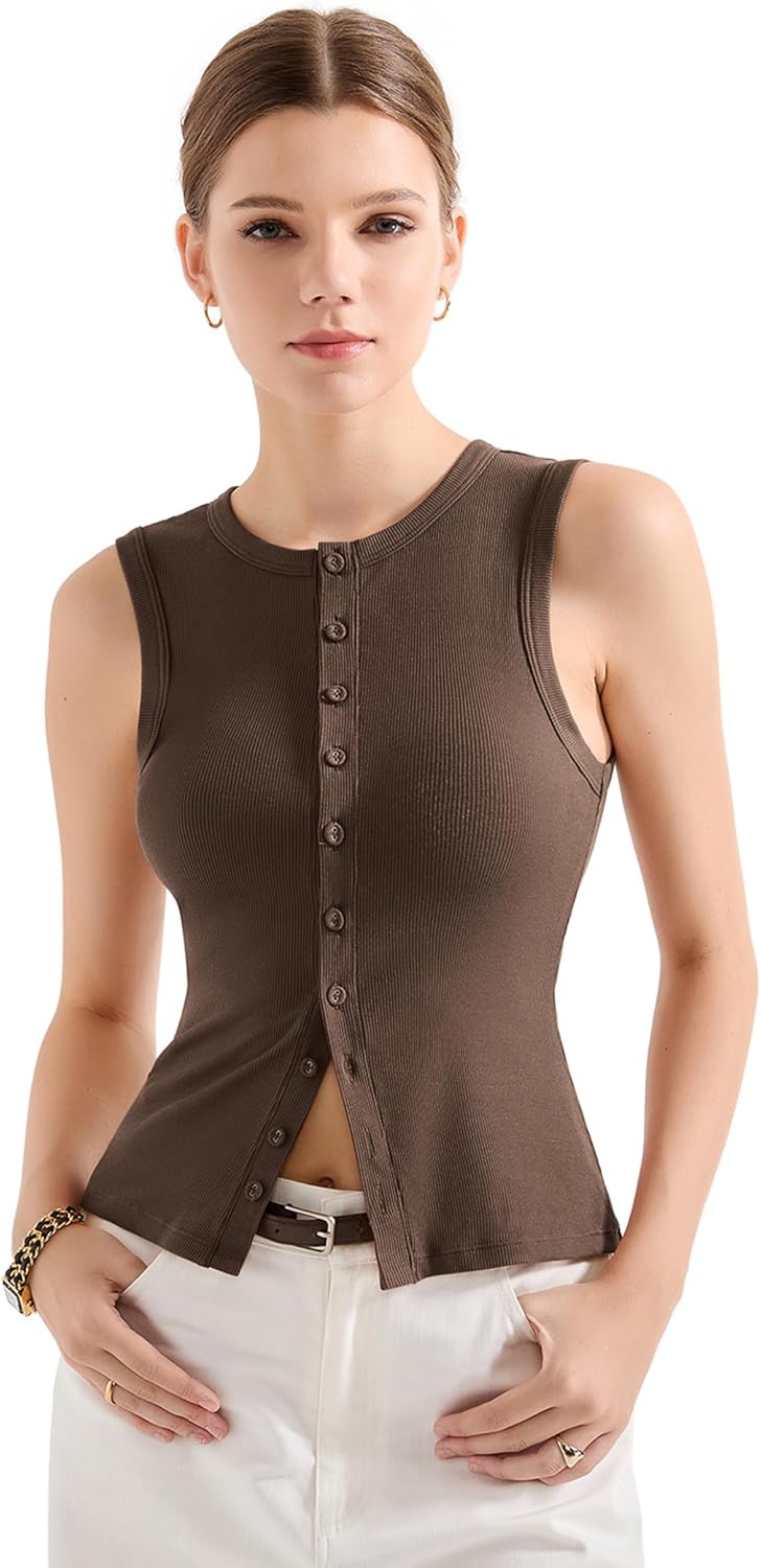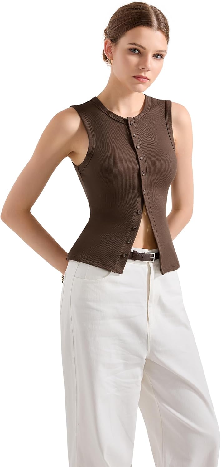 Trendy Y2k Fitted Tank Tops for Women: Open front, Button front closure, Crew Neckline, Split front hem, Slimming fit, Full Length
