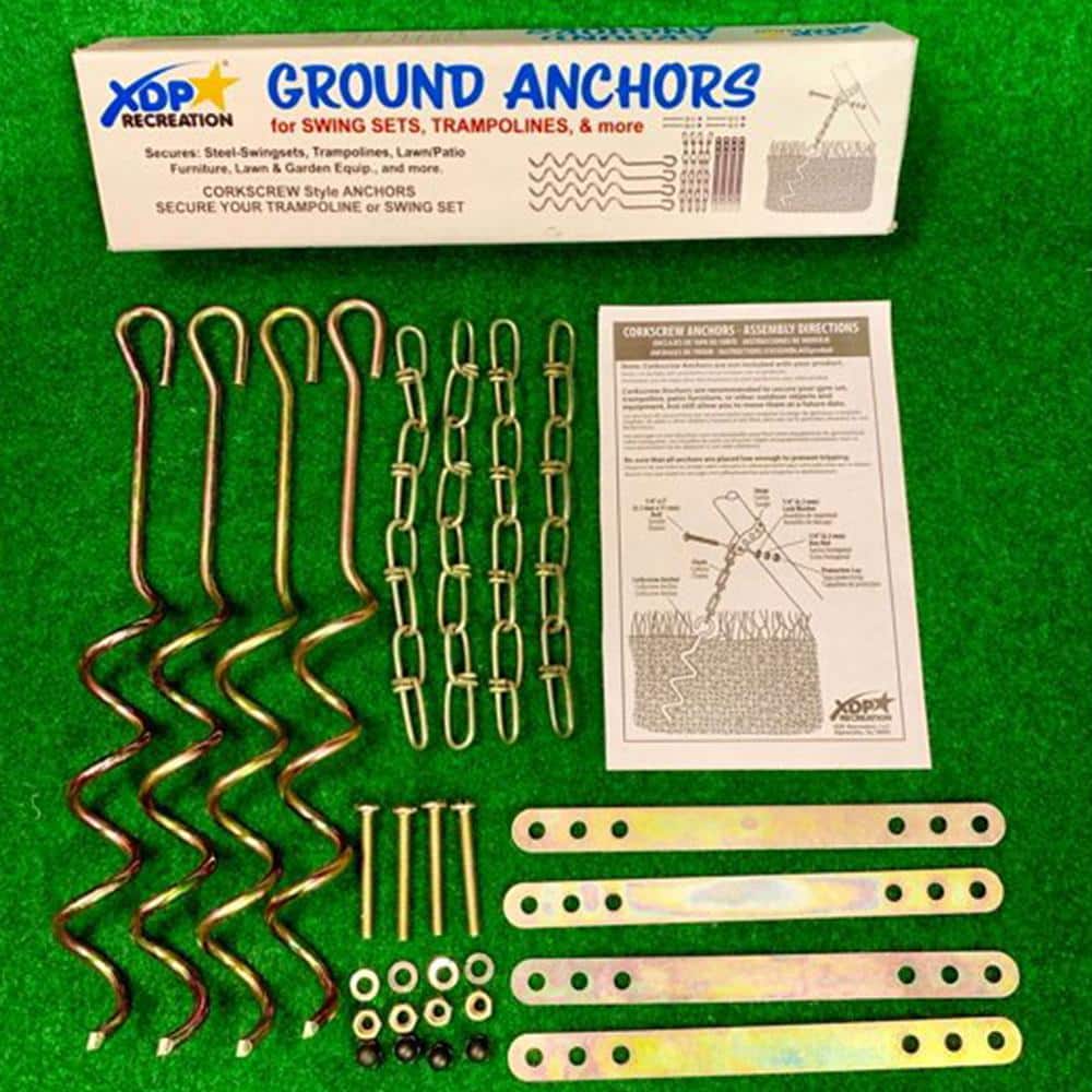 Safety has to be a top priority when it comes to your kids. While you might not always be able to catch them when they fall or snag them before they stumble, you can ensure their playsets are safe and securely planted firmly on the ground. Keep their swing sets and playsets anchored down with the XDP Recreation Swing Set Ground Anchor Kit. This set is quite comprehensive and includes 4 10 in. auger style ground anchors, additional attachment hardware, and extensive installation directions. The multiple attachment holes in the anchors make them versatile and compatible with all XDP Recreation swing sets and many other 2 in. diameter tubing models. Don't let a stiff wind or a freak accident cause your child's playset to dangerously tip over. Instead, keep your playset and other outdoor furniture securely on the ground with this extensive anchor kit. Ground anchor kit designed to work with swing sets, trampolines, or patio furniture. Allows you to safely anchor your metal frame playset into the ground, without concrete, for greater stability and durability. Will help prevent your playset from tipping or blowing over during strong winds. Provides safe and strong lock down of your swing set, trampoline, or other outdoor furniture. Multiple attachment holes allow anchors to secure to a variety of playsets. Compatible with all XDP Recreation swing sets and many other 2 in. diameter tubing competitive models. Set includes 4 10 in. auger style ground anchors, additional attachment hardware, and installation directions. Item type: Ground anchor kit. Material: Metal. Color: Black. Dimensions (L x W x H): 14 in. x 4 in. x 2 in.. Weight: 4 lbs.