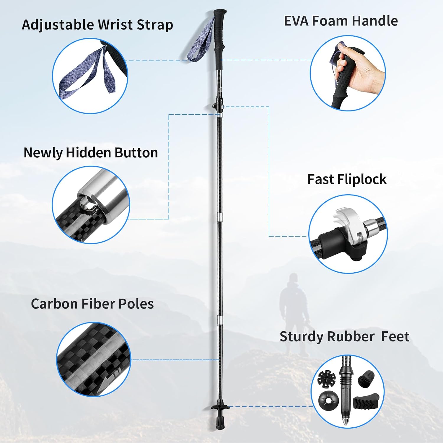 Portable Adjustable: Our carbon fiber trekking poles feature a 3 fold adjustable folding design. They can fold up to less than 15 inches for easy portability and are perfect for hikers, through hikers to carry in their bags.