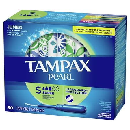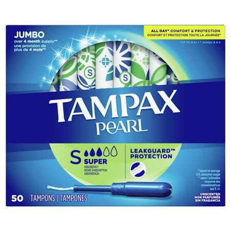 All day* comfort and protection available in five absorbencies with Tampax Pearl tampons * up to eight hours Gently expands to your individual shape thanks to Tampax FormFit protection FSA and HSA Eligible LeakGuard Braid helps stop leaks before they happen Anti-Slip Grip on applicator makes the tampons easy to insert Free of dyes, perfume, latex*, BPA, and elemental chlorine bleaching *natural rubber latex Your flow is different every day. Your tampon should be, too #1 U.S. Gynecologist recommended tampon brand* *based on 2020 survey Unscented Super Absorbency 50 Count Package