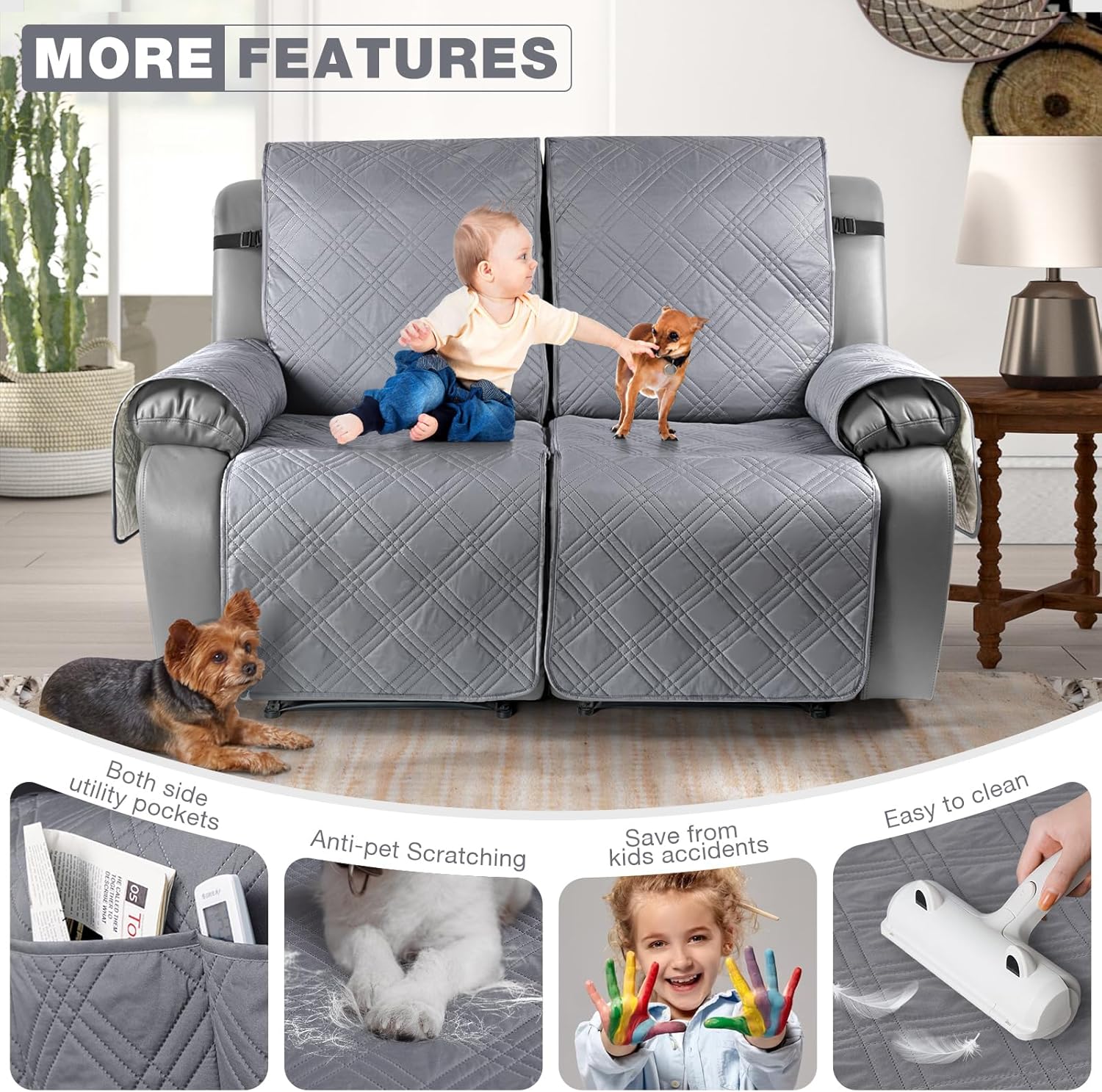 TAOCOCO 100% Waterproof Oversized Loveseat Recliner Cover, Non Slip Split Couch Covers for Reclining Loveseat with Elastic Straps for Kids Pets(Oversized 2 Seater, Gray)