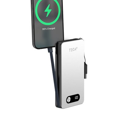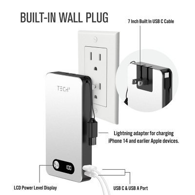Equipped with a 10,000mAh battery for all-day device power. Integrated USB-C cable and AC wall plug for seamless charging. Dual ports to support multiple devices, providing ultimate convenience. LCD display for easy monitoring of battery percentage. Comes with a Lightning adapter, making it compatible with older Apple devices. Ultimate All-in-One Charging Solution. The Tech Squared 10,000mAh Power Bank is your reliable power source on the go. Designed for those constantly on the move, this compact yet potent charger ensures your devices never run out of juice. With its high-capacity battery and versatile charging options, it is an ideal companion for busy professionals, students, and travelers. Built-In Convenience. Say goodbye to tangled cables and forgotten chargers. This power bank comes with a built-in 7-inch USB-C cable, ensuring you're always ready to charge compatible devices. The integrated AC wall plug allows you to recharge the power bank directly from any standard outlet, eliminating the need for extra adapters or cords. Charge Multiple Devices Simultaneously. Equipped with both a USB-A and a USB-C port, this power bank enables you to charge multiple devices at once. Whether you're powering up a smartphone, tablet, headphones, or other USB-powered gadgets, you can do so efficiently and effortlessly. Smart LCD Display for Battery Monitoring. Never be caught off guard with a low battery again. The built-in LCD display provides a clear, real-time percentage of remaining power, ensuring you always know when it’s time to recharge. Universal Compatibility. With the included Lightning-to-USB-C adapter, this power bank supports older Apple devices like iPhones up to the iPhone 14. This ensures that users with various devices can enjoy seamless and hassle-free charging. Stay connected and powered up with the Tech Squared 10,000mAh Power Bank—your ultimate charging companion for life on the go. Enjoy complimentary Apple Service Trials with this purchase. Redemption instructions will be emailed post purchase. Terms apply.