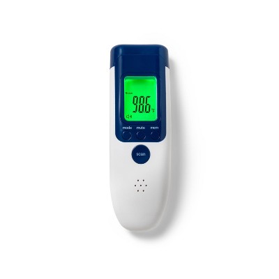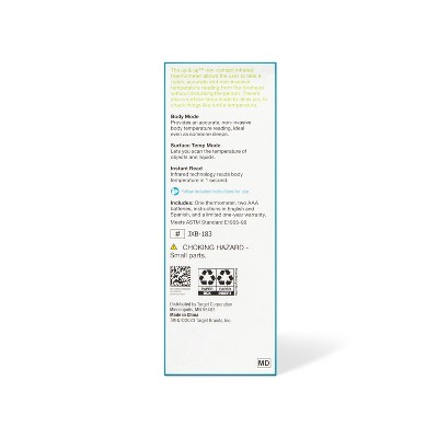 The Temple Non-Contact Infrared Thermometer from up&up™ uses instant-read infrared technology for an accurate, non-invasive body temperature reading, even while someone is sleeping. With an easy-to-read backlit LCD display, taking temps at night is a breeze. Plus, the memory recall, fever indicator and automatic shutoff help keep your mind at ease. Best of all, there are handy room and surface modes available if needed.