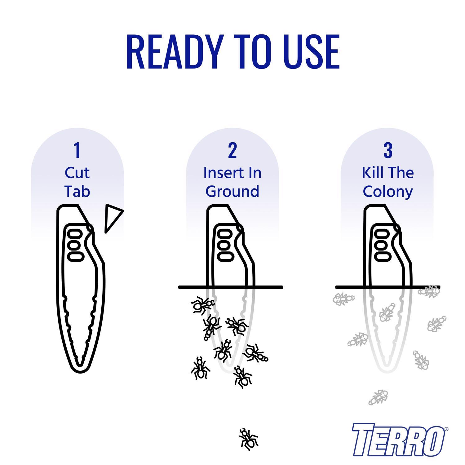 Terro Outdoor Liquid Ant Bait Stakes stop the problem at the source. The stakes target ants outdoors before they make their way into your home. The slow-killing poison gives ants the time to transport the bait back to their colony, eliminating all worker ants and the queen. The bait attracts and kills all common household ants. Terro Outdoor Liquid Ant Bait Stakes come pre-filled and ready to use. Simply place the stakes in outdoor areas where you see traces of ants, break off the activation tab, and let the bait work its magic. No tools are needed to push the stake into the ground, just your hand. A see-through window enables you to monitor the bait level so you know when itâs time to be replaced. When the bait is empty, dispose of the stakes in the garbage. Place Terro Outdoor Liquid Ant Bait Stakes near ant colonies or other locations where they are numerous. Apply the stakes near the perimeter of your home, especially near entrances where you think they may be getting inside. The stakes are weatherproof, offering protection in any condition. The more bait placements, the better. When the stakes are first placed in the ground, a large number of ants are going to appear. Donât worry because this is perfectly normal. The formula was created to allow worker ants to consume the product and survive long enough to transport the bait back to the nest. They will then infect the rest of the colony with the poison, eliminating the worker ants and the queen. Terro Outdoor Liquid Ant Bait Stakes kill ants before they enter your home. The liquid ant bait works to eliminate all common household ants.