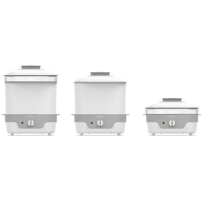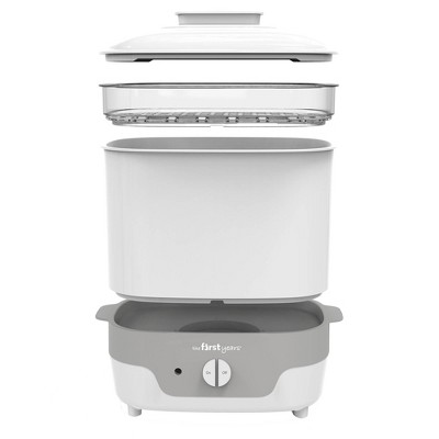 Kill germs the natural way with The First Years Modular Steam Sterilizer. Natural steam kills 99% of common germs in minutes; there's no need for harsh chemicals or additives. The modular design, with two trays, provides plenty of room for sterilizing while saving counter space. Holds up to 6 bottles. The top tray is perfect for bottle nipples, baby teethers, breast pump parts, pacifiers and other smaller items. The bottom tray is specially designed for bottles, cups and larger items. Use either tray, or both depending on your needs for the day. The clever design of the bottom tray directs steam deep inside bottles and both trays fully circulate the steam to make sure every surface is covered. This steam sterilizer doubles as a handy storage space, keeping the things inside sterilized for up to 24 hours.