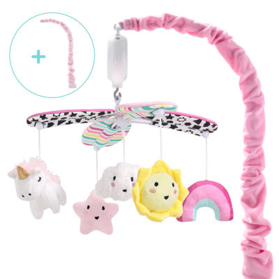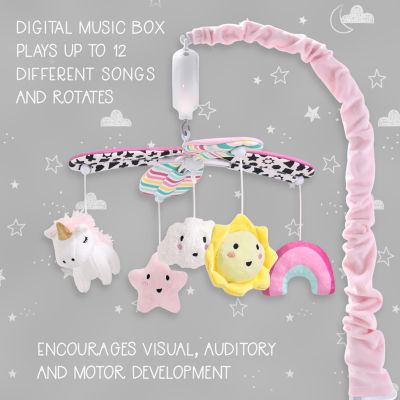 Made especially for baby's view, the pink look up mobile is a thoughtfully designed nursery essential from the peanutshell. The eye-catching mobile promotes sensory development and self-soothing. Primary bright and montessori inspired black and white prints provide high contrast visual stimulation. Sharpen baby's fine motor skills as they reach for 5 eye-catching plush pieces including a magical unicorn, smiling sun, stellar star, fluffy cloud, and radiant rainbow. The mobile comes with two interchangeable pink fabric arm covers and fits all standard cribs. A digital music box plays snippets of 12 lullabies that soothe baby to sleep. 3 preset options: music & motion; music without motion; motion without music. Volume control and timed auto stop. two aa batteries (not included) are required.Features: Plays Music, RotatingRecommended Ages: 0-5 MonthsBed Size: CribMeasurements: 28 Length/InchesMobile Measurements: 10 Depth/InchesBase Material: 100% PolyesterFilling Content: 100% PolyesterCare: Wipe CleanCertifications And Listings: Meets Cpsia RequirementsCountry of Origin: Imported