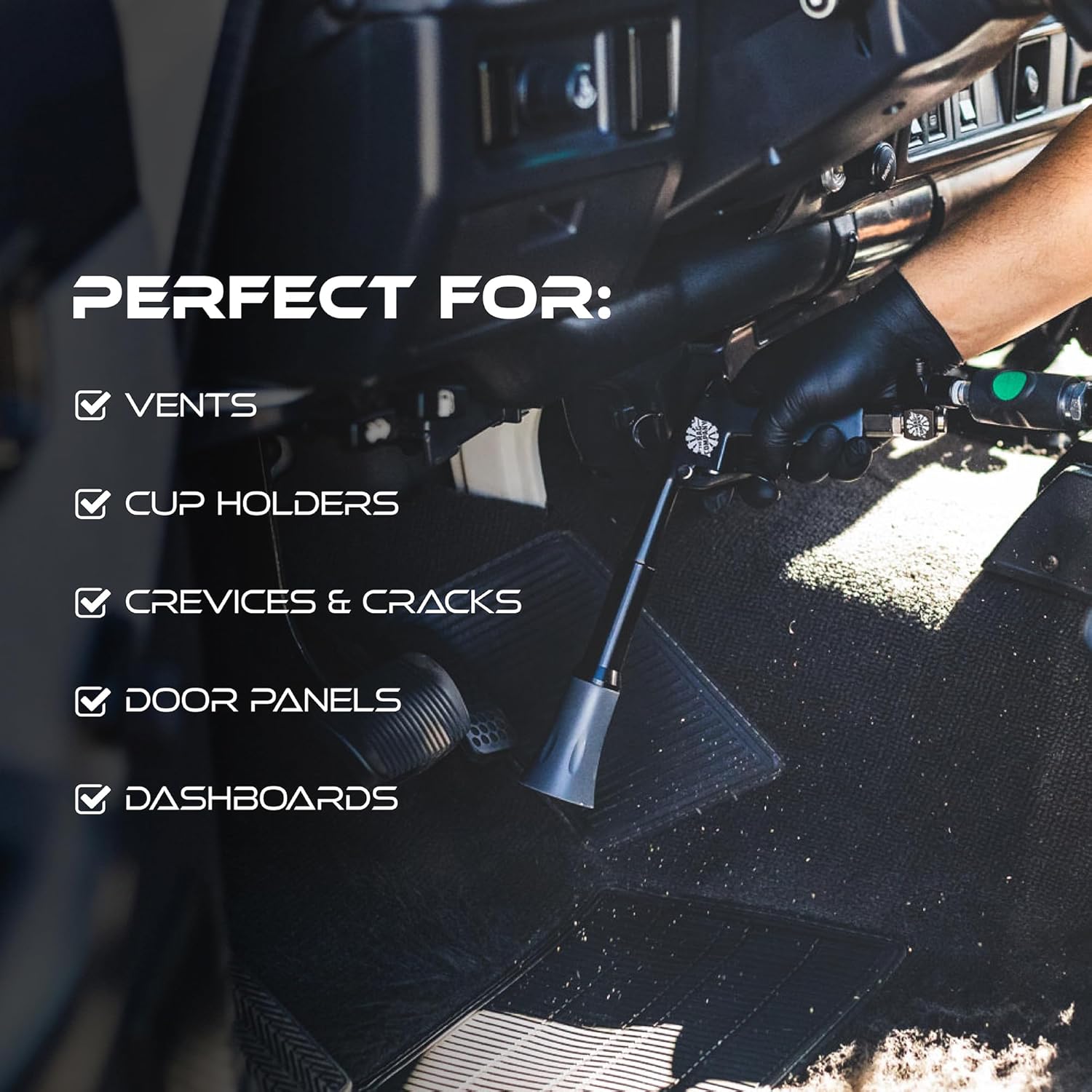 POWERFUL AIR CLEANING TOOL for all automotive surfaces including carpets, leather, plastic, air vents, engine bays, and much more. Also effective on wheels, vinyl tops, and hard-to-reach areas.