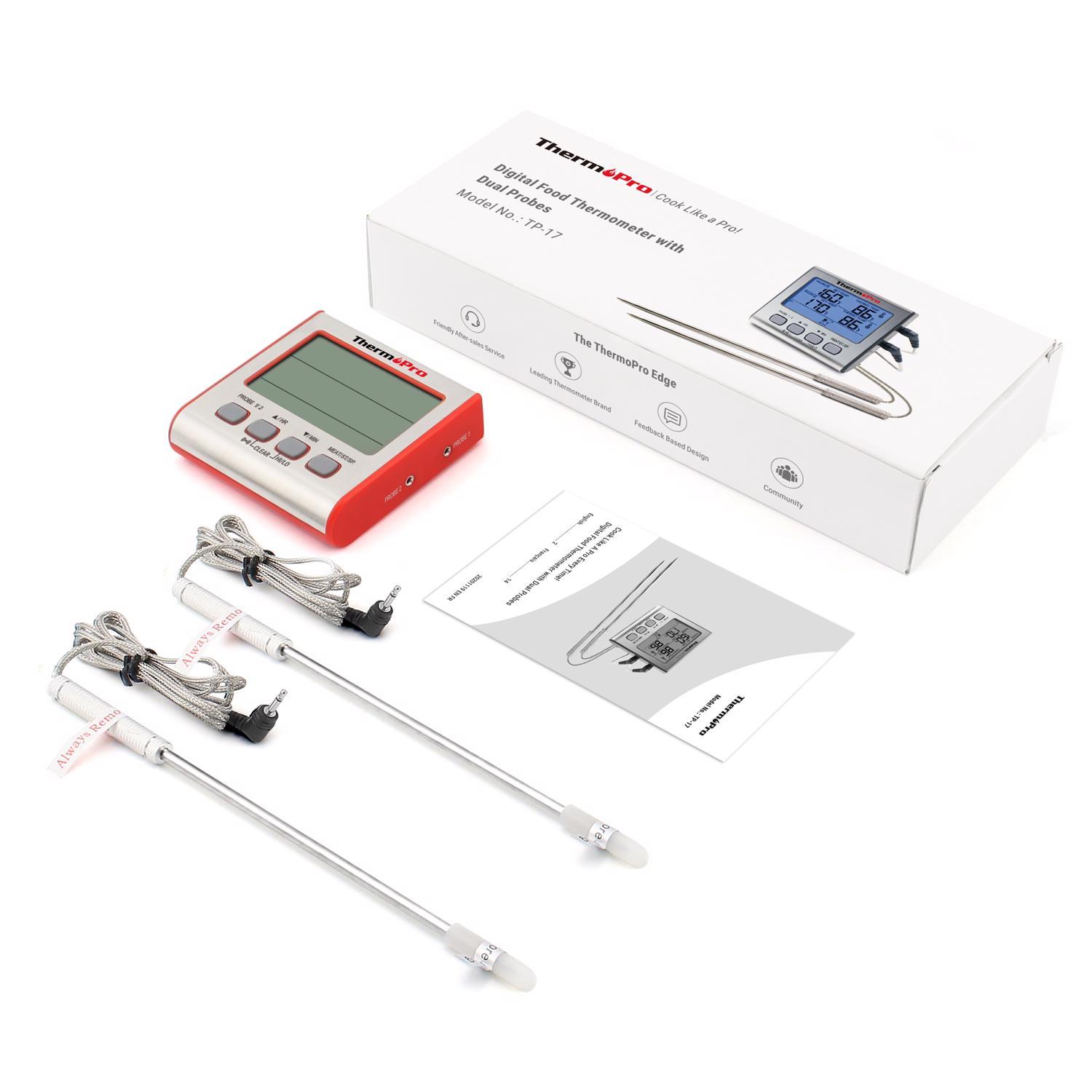 ThermoPro TP17W is an ideal grill thermometer for experienced and inexperienced cooks alike. You no longer have to worry about achieving that mouthwatering brisket or that heavenly smoked chicken, let the ThermoPro TP17W take care of the hard part and help you cook your meat like a pro everytime. Equipped with 2 probes, the versatile TP17W gives you the option of monitoring the BBQ temperature along with the temperature of your food or you could use the second probe to monitor an extra piece of meat. So go ahead and work on other side dishes, or go watch the game in your living room, TP17W will sound an alarm when it's time to take the meat off the heat.