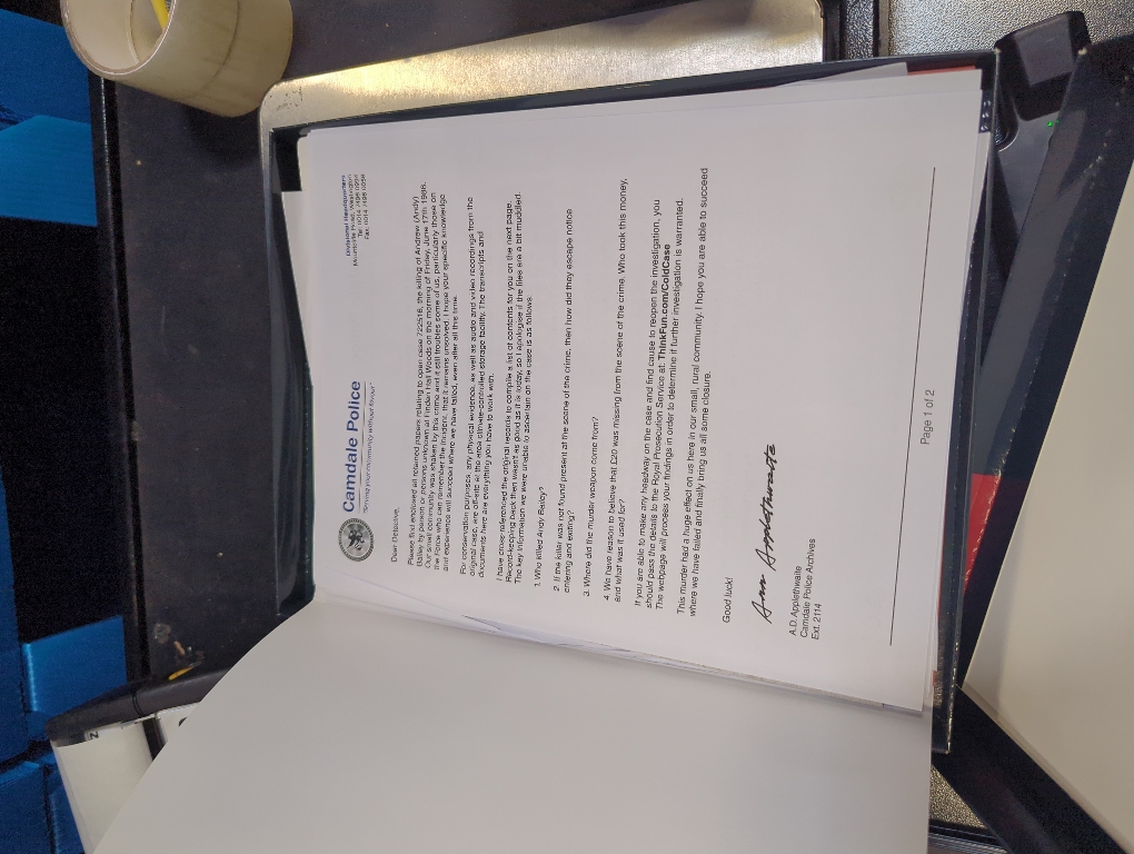 Inside the box, you will find realistic documents pertaining to the crime, containing everything you need to crack the case. Examine the clues, piece together the evidence, and solve the murder! Then submit your answer online to see if you are correct and have finally brought Camdale the justice it deserves. Great for a small group of friends or a single-player experience, Cold Case: A Story to Die For integrates puzzle-solving and crime fiction into an immersive investigative experience. 1-4 Players | Ages 14