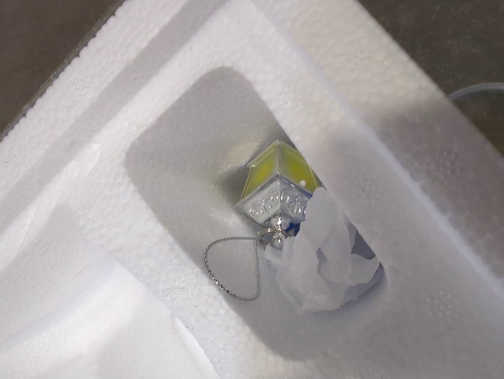 HANDCRAFTED DETAILS: Glitter dusting, silvery mittens, scarf and lantern add festive charm