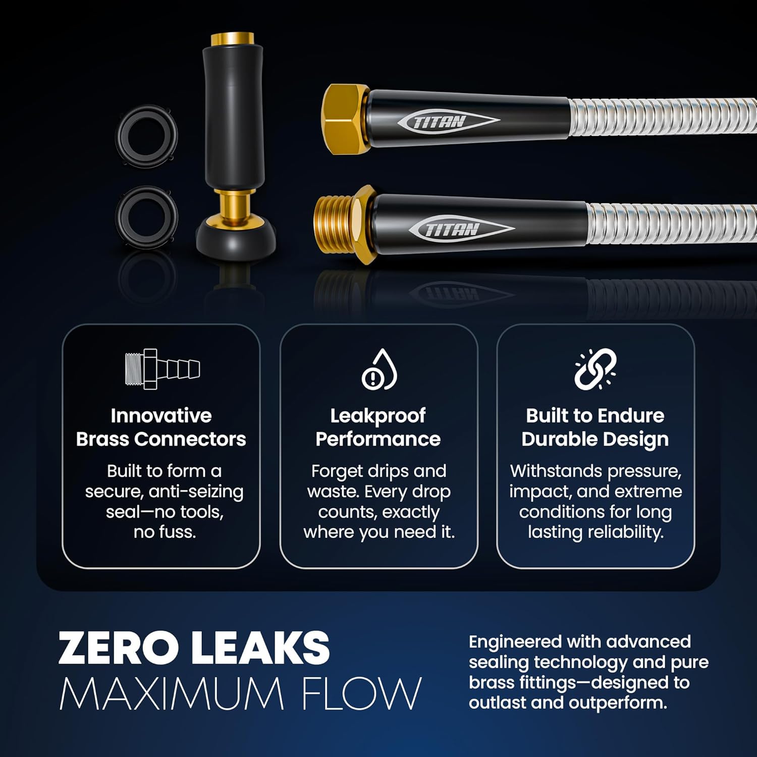 [True 304 Stainless Steel Outer Shell] Unlike cheaper stainless steel garden hoses that use lower-grade alloys, Titan hose is crafted from genuine 304 stainless steel for unmatched corrosion resistance, strength, and longevity. It’s built to withstand the elements year after year without rusting, splitting, or degrading in sunlight.
