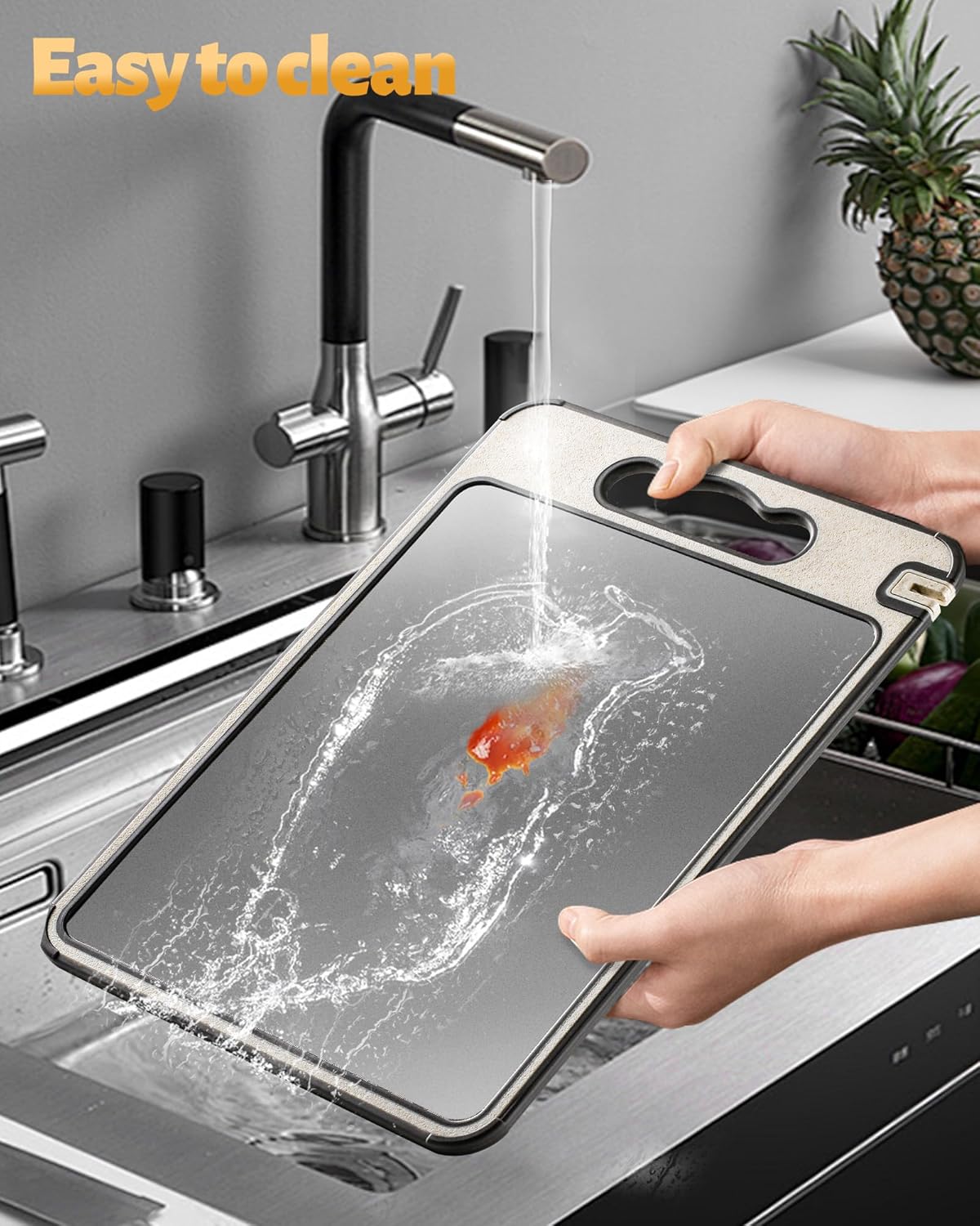 DOUBLE SIDED CUTTING BOARD: The perfect One side of the Titanium cutting board uses 100% Titanium, suitable for cutting raw and cooked meat. The other side uses high-quality food-grade wheat straw pp material (BPA-free), suitable for cutting vegetables and fruits. Sturdy and lasting, no cross confusion, healthy and odorless.