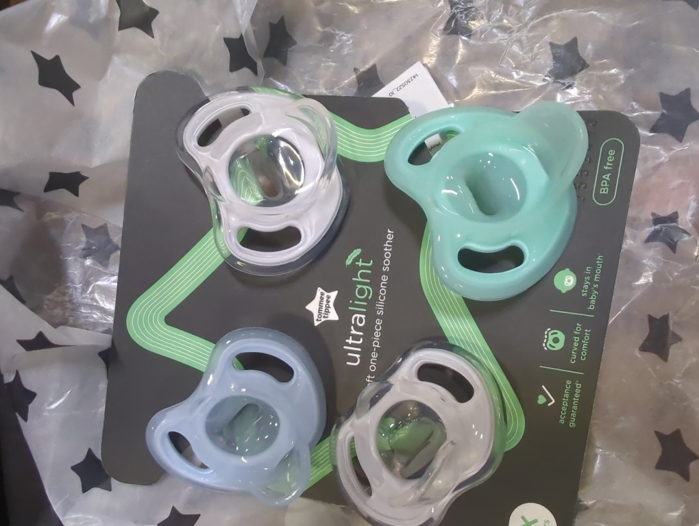 Tommee Tippee Ultra-Light Silicone Pacifier, 0-6 Months, Symmetrical One-Piece Design, BPA-Free Silicone Binkies, Clear/Blue/Green, Pack of 4