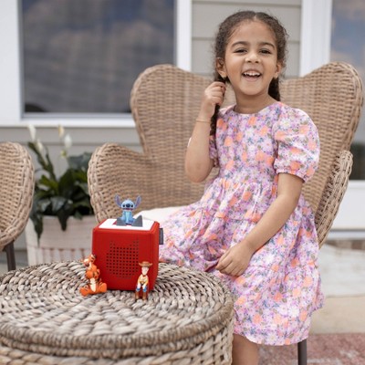 Made by parents, for parents. The Toniebox is an imagination-building, screen-free, educational, digital listening experience speaker that plays stories, songs, and much more. Designed to foster imagination, activity, and independent play for children ages three and up, it's everything a young explorer's growing mind needs! One little box. Countless Big Adventures. The Toniebox comes to life when paired with our whimsical collection of Tonies, hand-painted characters with hours of stories to tell, worlds to explore, and songs to sing. Included in the Bundle is a red Toniebox, charging station, instruction manual and three Tonies: Woody Tonie from Toy Story, Tigger from Winnie the Pooh and Lilo & Stitch Tonie, each with their own fun stories and songs. A wide variety of Content Tonies are sold separately, start your collection today!