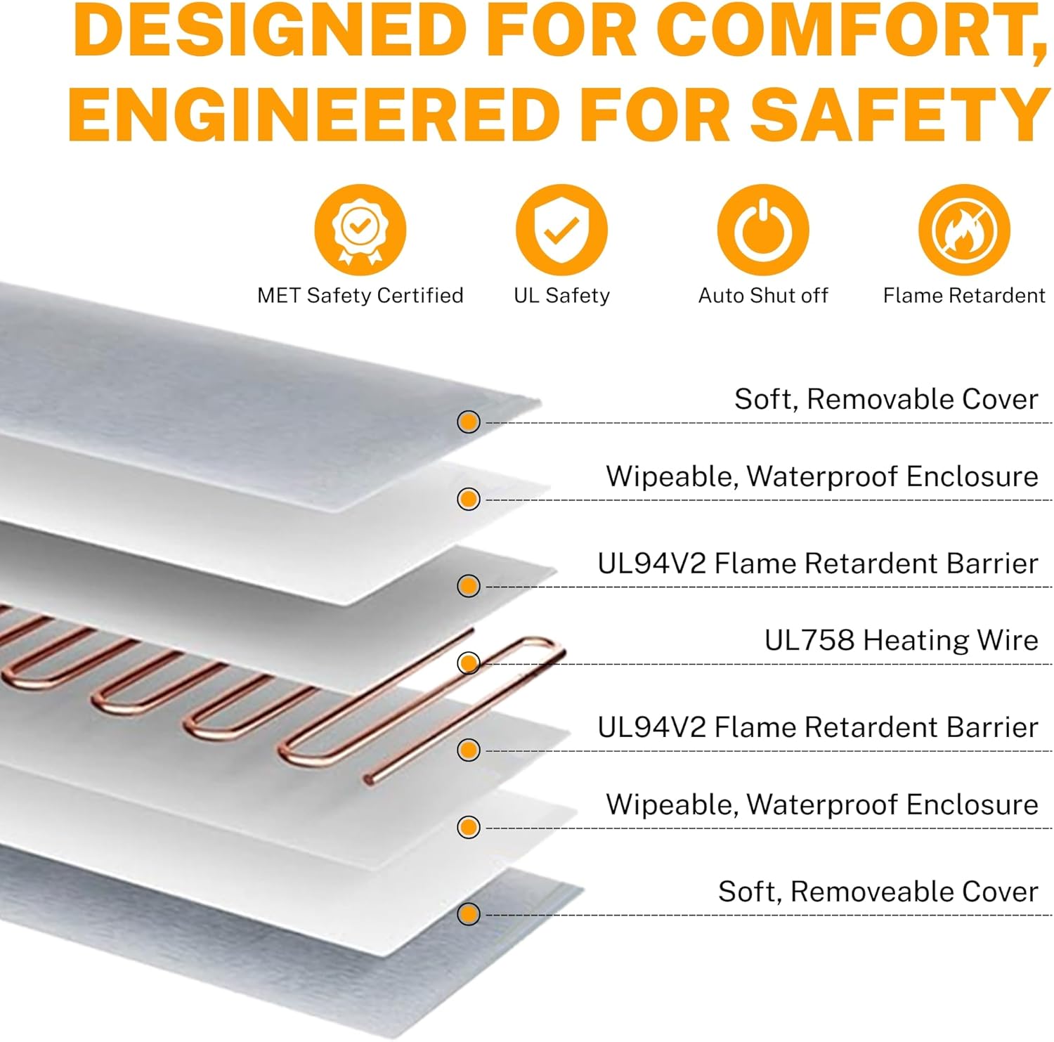 Safe & Secure: Boasts a 7-layer protection with UL-certified heating wire, waterproof and flame-retardant envelope, and a built-in temperature sensor for ultimate safety.