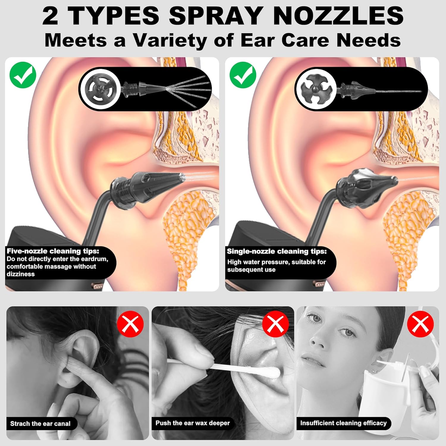 【Safe & Effective Cleaning Technology】-This ear wax removal kit features 3 pressure modes (gentle, pulse, strong). Whether you like gentle cleaning or deep rinsing, this earwax cleaner can meet your preferences. The flared design of the ear tips prevents over-insertion during use