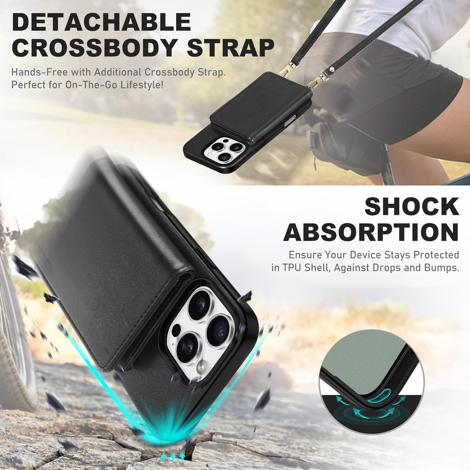 TUCCH Crossbody Wallet Case for iPhone 16 Pro (6.3"), RFID Blocking [6 Card Slots][Detachable Adjustable Lanyard], Magnetic Flip Wallet PU Leather Shockproof Phone Cover for iPhone 16 Pro, Black