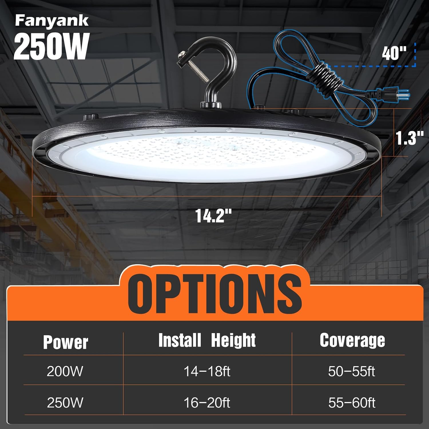 High Brightness: Fanyank New Upgrade 250W UFO Led High Bay Light,Luminous efficiency up to 35000lm,With high-quality SMD3030 LED chips and a light efficiency of up to 150LM/W, illuminating your warehouse, workshop, factory, barn, or garage area with ease and clarity.