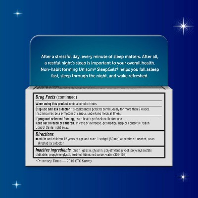 When a stressful day gets in the way of a restful night, you need something that can help you fall asleep and wake up refreshed. Unisom SleepGels are over-the-counter sleep-aids that help you fall asleep fast and get a good night's sleep to recharge and restore your body. The liquid-filled SoftGels with diphenhydramine HCI leave no chalky taste behind like some other pills and are proven to be safe if used as directed and non-habit forming. Take control of your sleep with Unisom, the #1 Pharmacist Recommended OTC Sleep-Aid Brand.