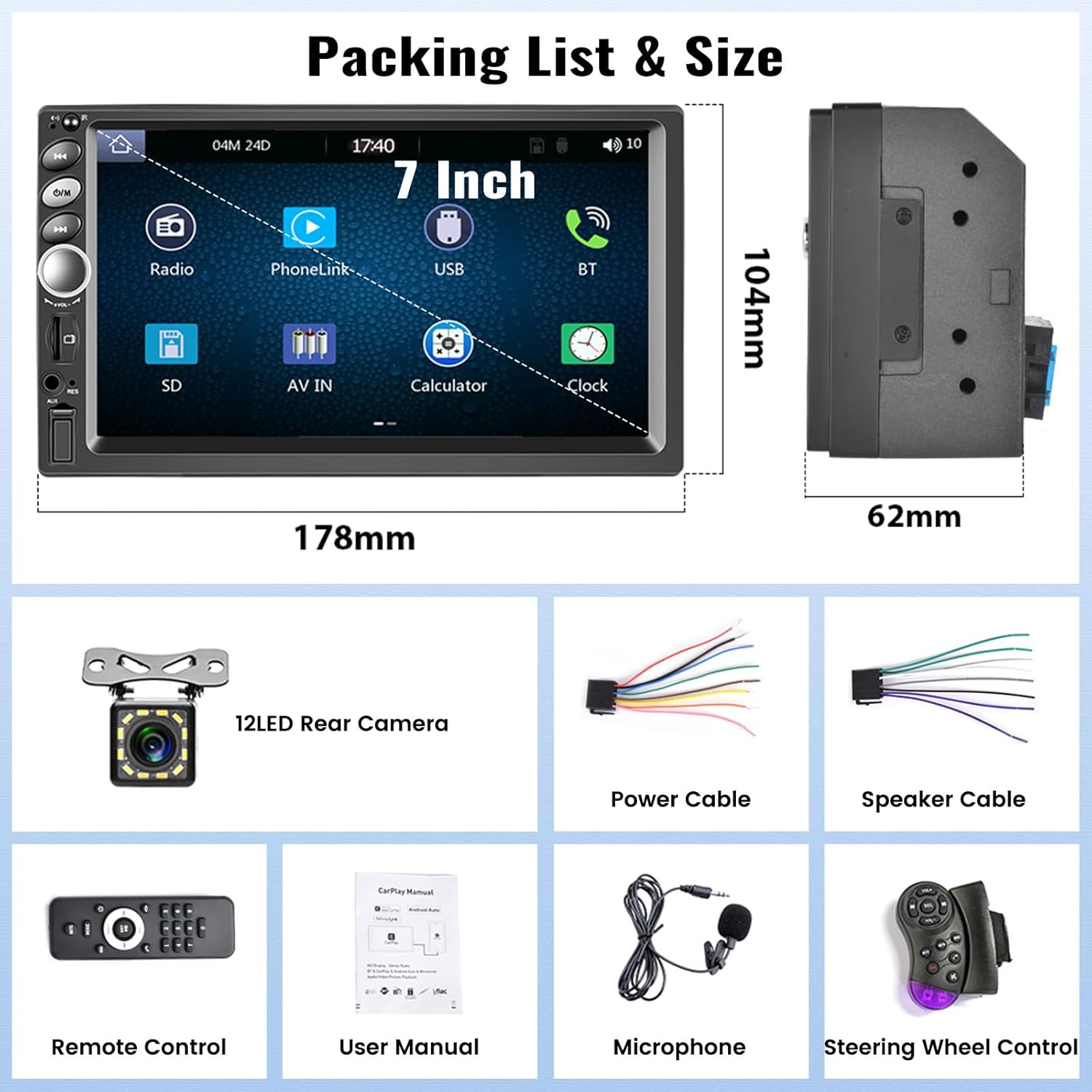 【Compatible with Apple CarPlay & Android Auto】Double din 7 inch touchscreen car stereo has built-in Apple carplay and Android Auto voice control via USB cable connection with your smartphone, you can make phone calls, online GPS navigation, video, music and emails, focusing on your driving and be hands-free, safer, external mic, remote control and steering wheel control are included