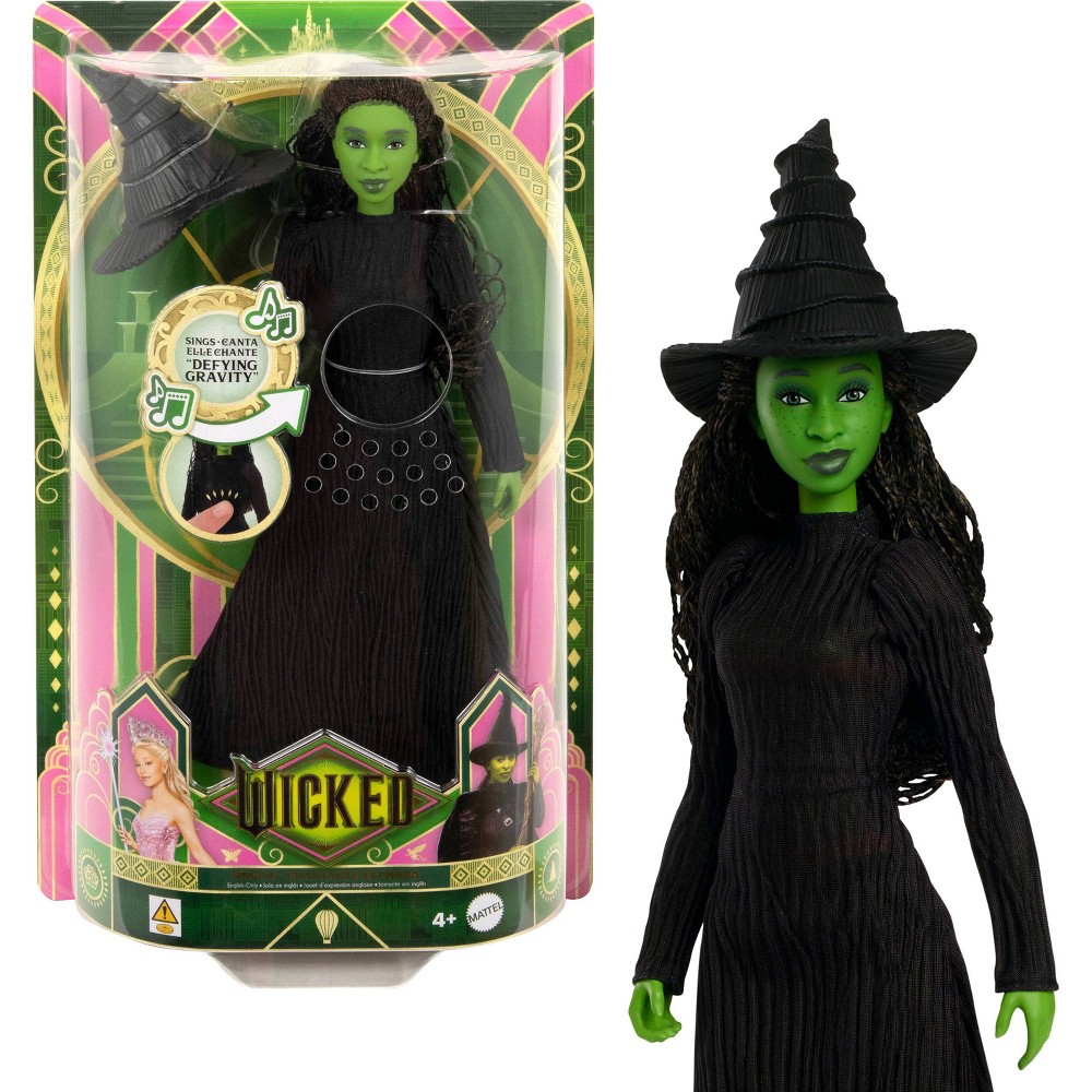 Sing along with Elphaba! Inspired by Universal Pictures' Wicked. Posable singing Elphaba fashion doll. Removable, soft black gown, signature pointed hat, and chunky heeled shoes. Long, braided hair, green skin. Musical gift for fans of the Wicked musical.