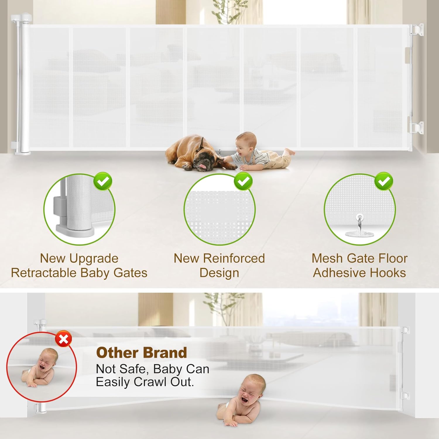 Upgrade 150 inch Retractable Baby Gates Extra Wide with Reinforced Strip Design to Prevent Crawling Through, 150 Retractable Dog Gate, 34 Tall, Retractable Gate for Indoor/Outdoor